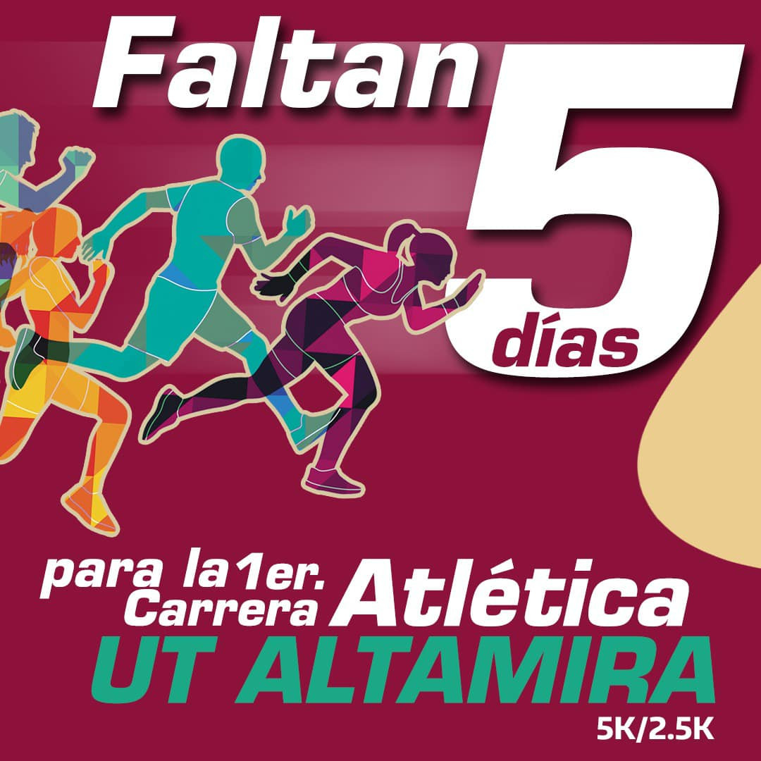 Corre, trota o camina en familia en la 1er Carrera Atlética de la Universidad Tecnológica de Altamira. Habrá medallas, premios en efectivo, rifas y muchas sorpresas más. Domingo 3 de septiembre, 7 a.m.