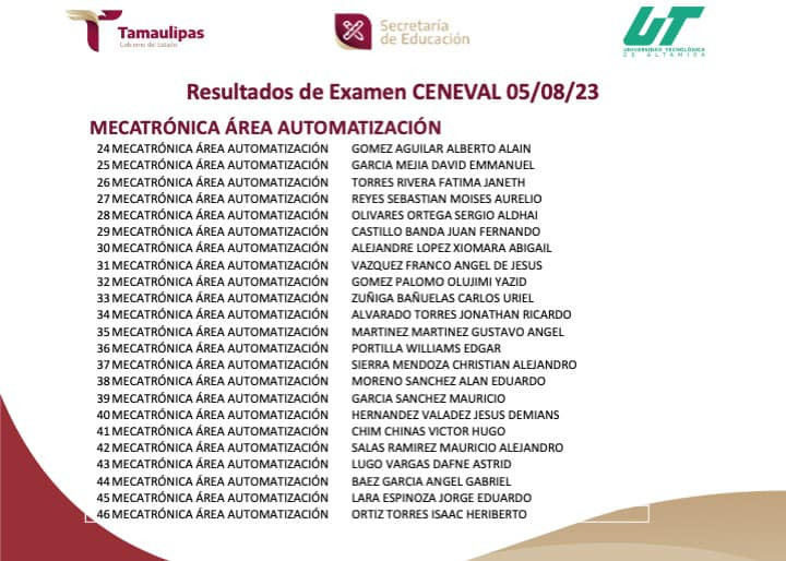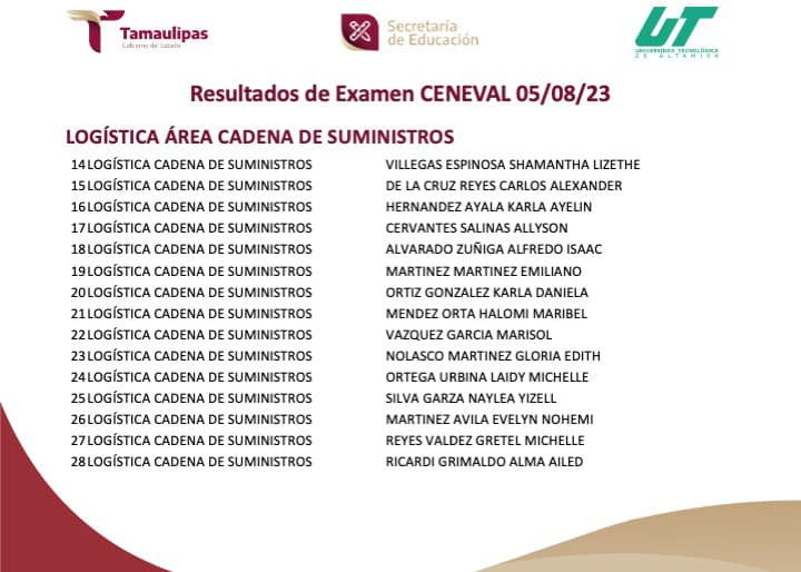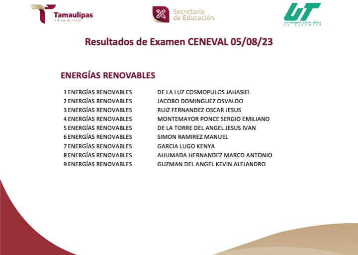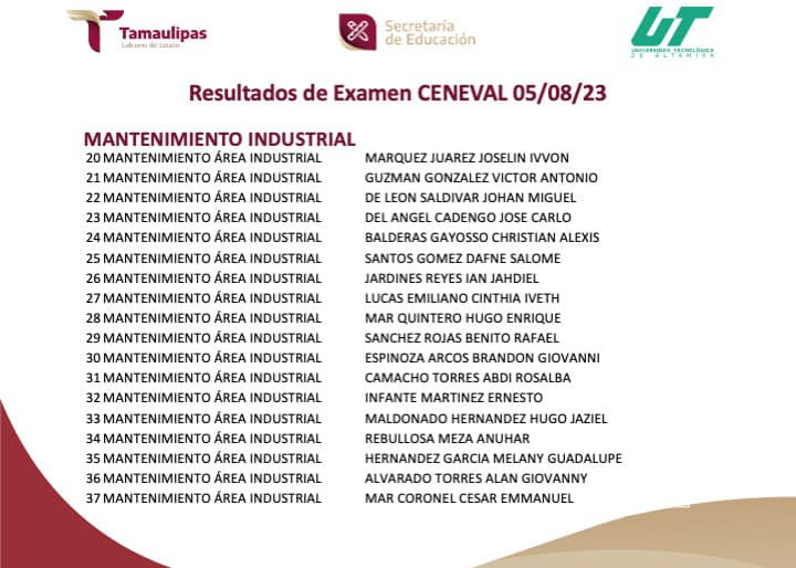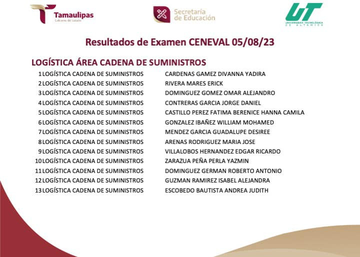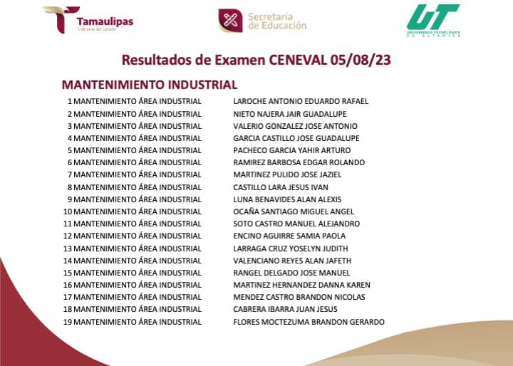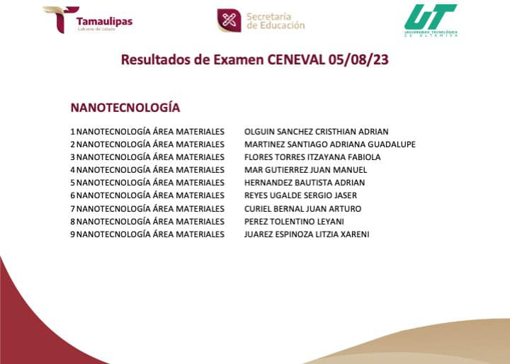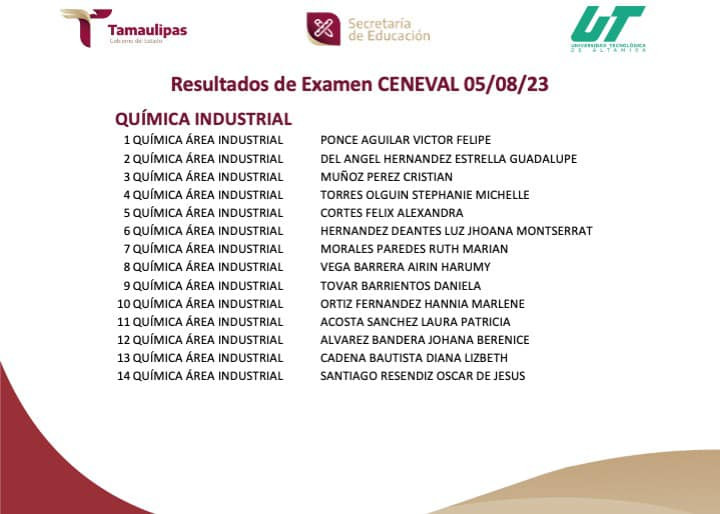 RESULTADOS del Examen CENEVAL aplicado el 05/08/2023. Para cualquier información adicional puedes contactar al Departamento de Servicios Escolares al E-mail: escolares@utaltamira.edu.mx