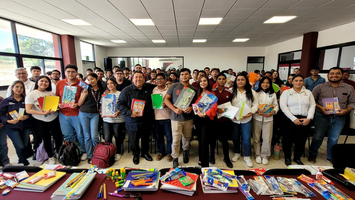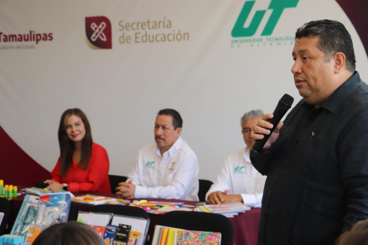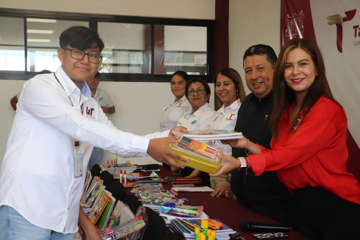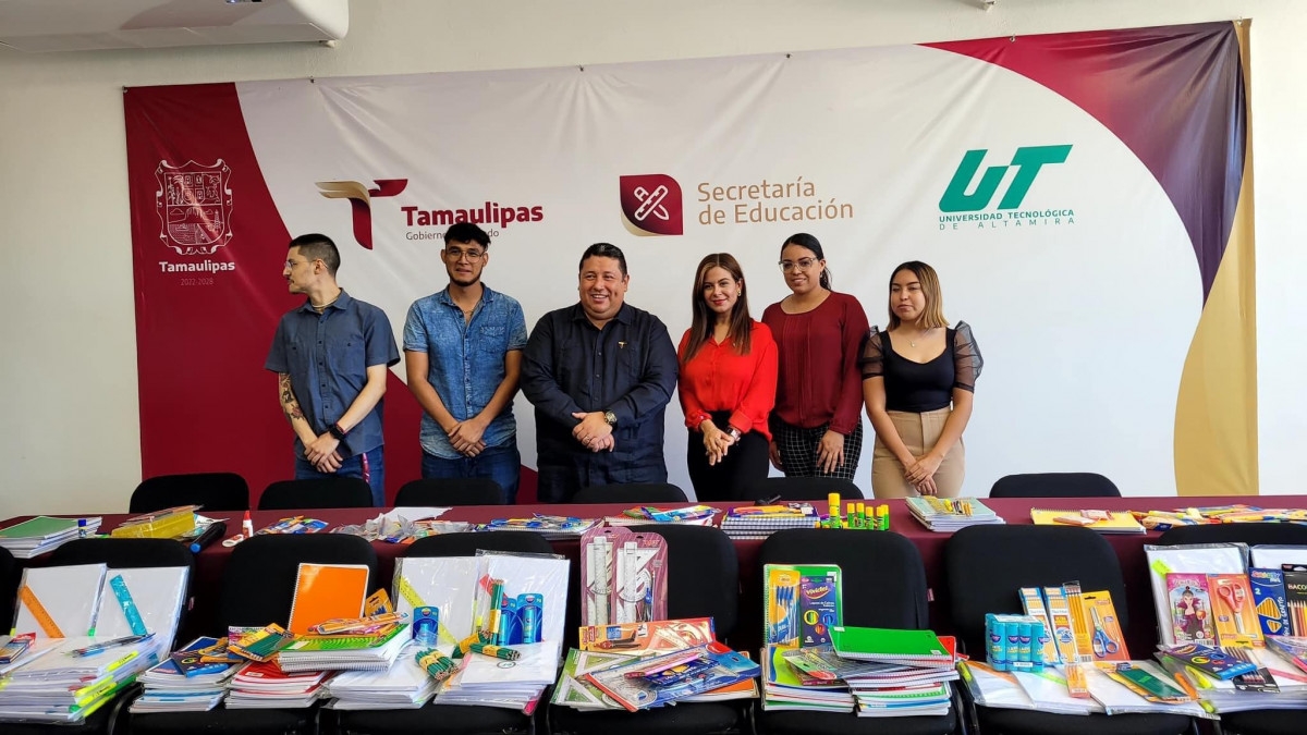 Alumnas y alumnos de nuestra Universidad Tecnológica de Altamira entregaron material recabado para la campaña de colecta de útiles escolares “Aprendiendo con Amor”