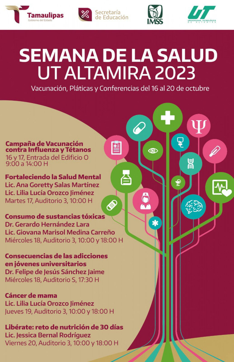 Invitamos a toda nuestra Comunidad a las actividades de la SEMANA DE LA SALUD UT ALTAMIRA 2023 por realizarse del 16 al 20 de octubre en nuestra Universidad Tecnológica de Altamira.