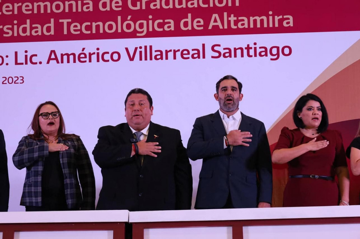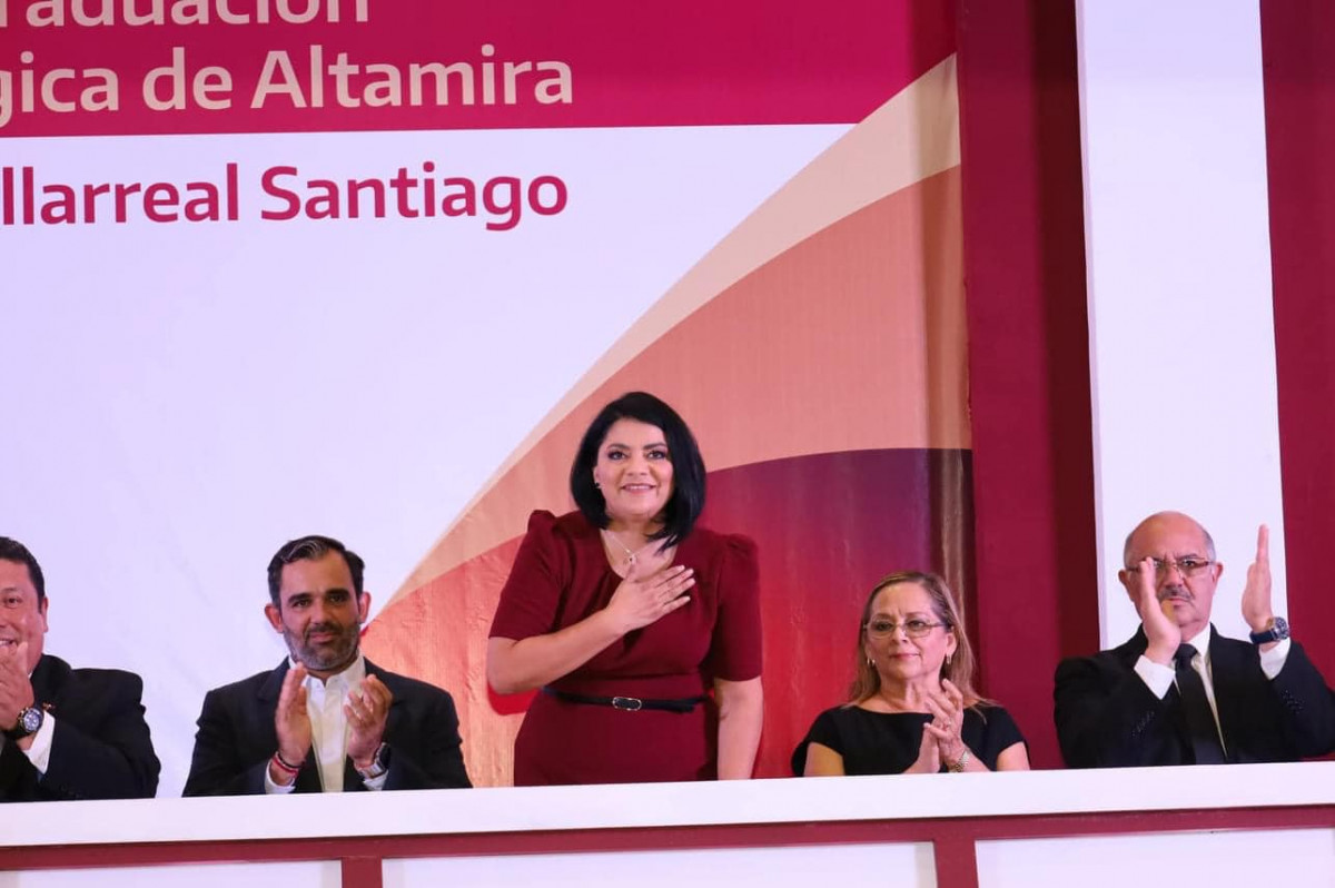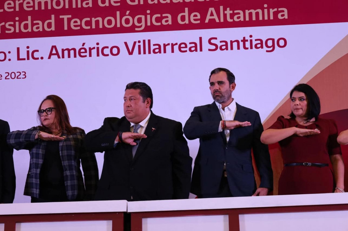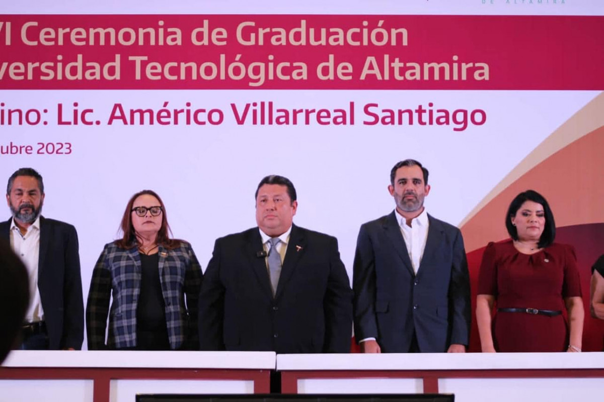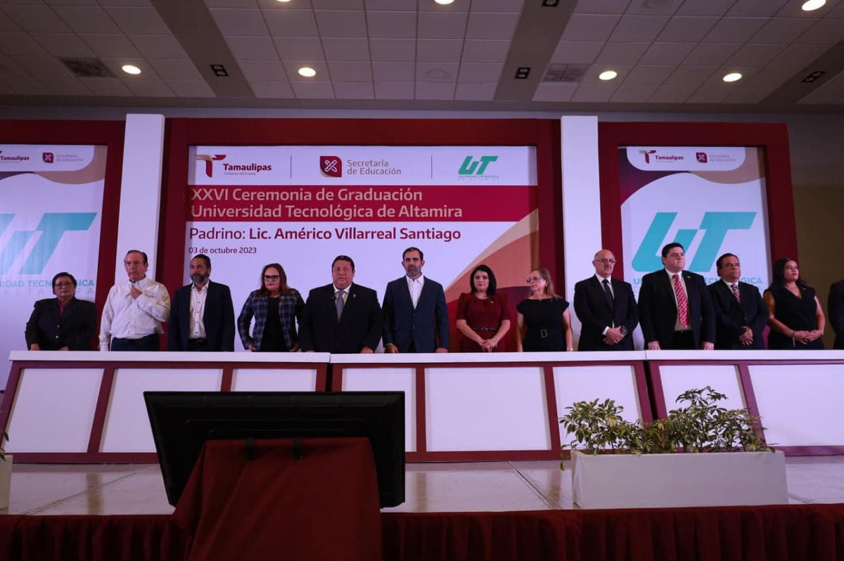 Con un presídium integrado por invitadas e invitados de honor, destacamos la presencia de la diputada Ursula Patricia Salazar Mojica, presidenta de la Junta de Gobierno del Congreso de Tamaulipas; Dip. Jesús Suárez Mata, diputado del Distrito XX del Congreso de Tamaulipas; Mtra. Alma Liliana Morado Saldívar, coordinadora de los Organismos Públicos Descentralizados (OPDS) de Educación en Tamaulipas, quien asistió en representación de la Mtra. Lucía Aimé Castillo Pastor, secretaria de Educación de Tamaulipas; C.P. Rosa Irma Luque Pérez, presidenta del Sistema DIF Altamira, así como del Dr. Rubén Ely Ramírez Rivas, director general del COBAT; Dr. Juan Guillermo Mansur Arzola, director general del ITABEC; Ing. David Abel Hernández Gamiz, gerente general de la AISTAC; Mtro. Marco Antonio Moreno Castellanos, rector del COLTAM; Dr. Jesús Ricardo Ramos Sánchez, rector de la UPALT y Lic. Jorge Luis Cisneros Martínez, jefe del CREDE Altamira.