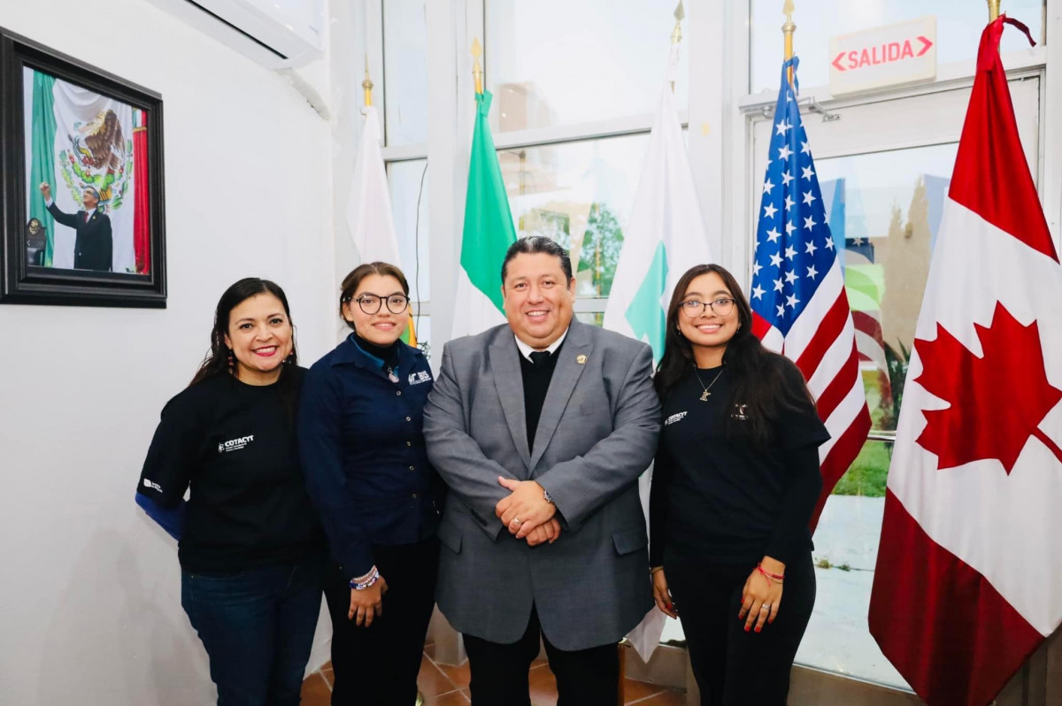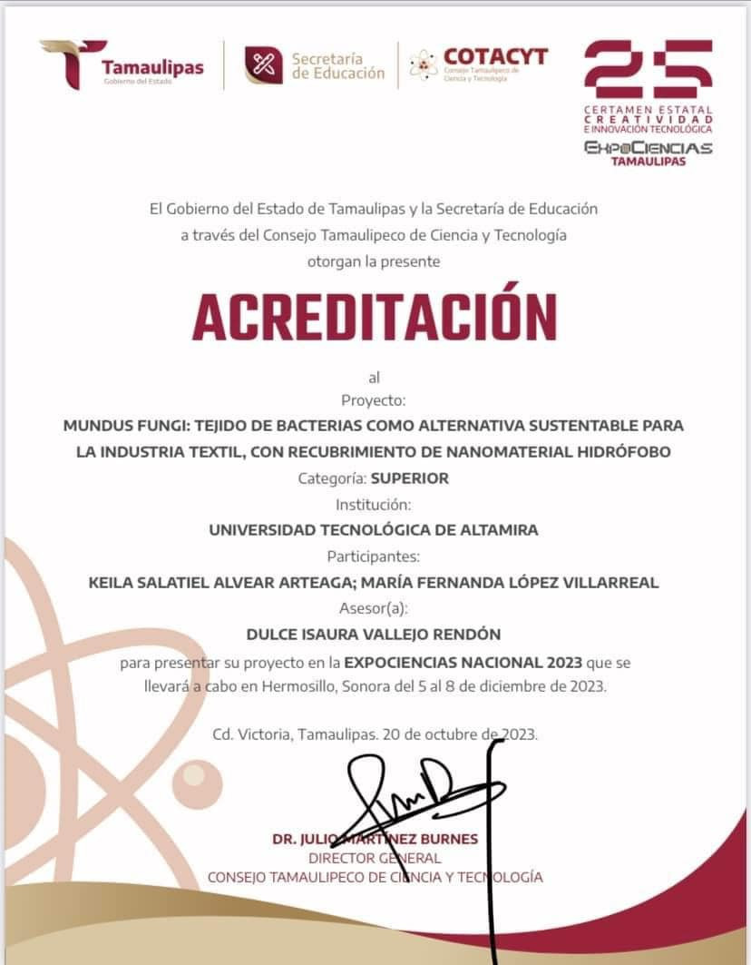 Nuestro rector, el Mtro. Juan Dionisio Cruz Guerrero felicitó a nuestras alumnas de Nanotecnología: María Fernanda López Villarreal y Keila Salatiel Alvear Arteaga, así como a su asesora, Mtra. Dulce Isaura Vallejo Rendón, por haber obtenido la acreditación para presentar su proyecto “Mundus Fungi: tejido de bacterias como alternativa sustentable para la industria textil, con recubrimiento de nanomaterial hidrófobo” en la EXPOCIENCIAS NACIONAL 2023 por desarrollarse en diciembre en Hermosillo, Sonora.