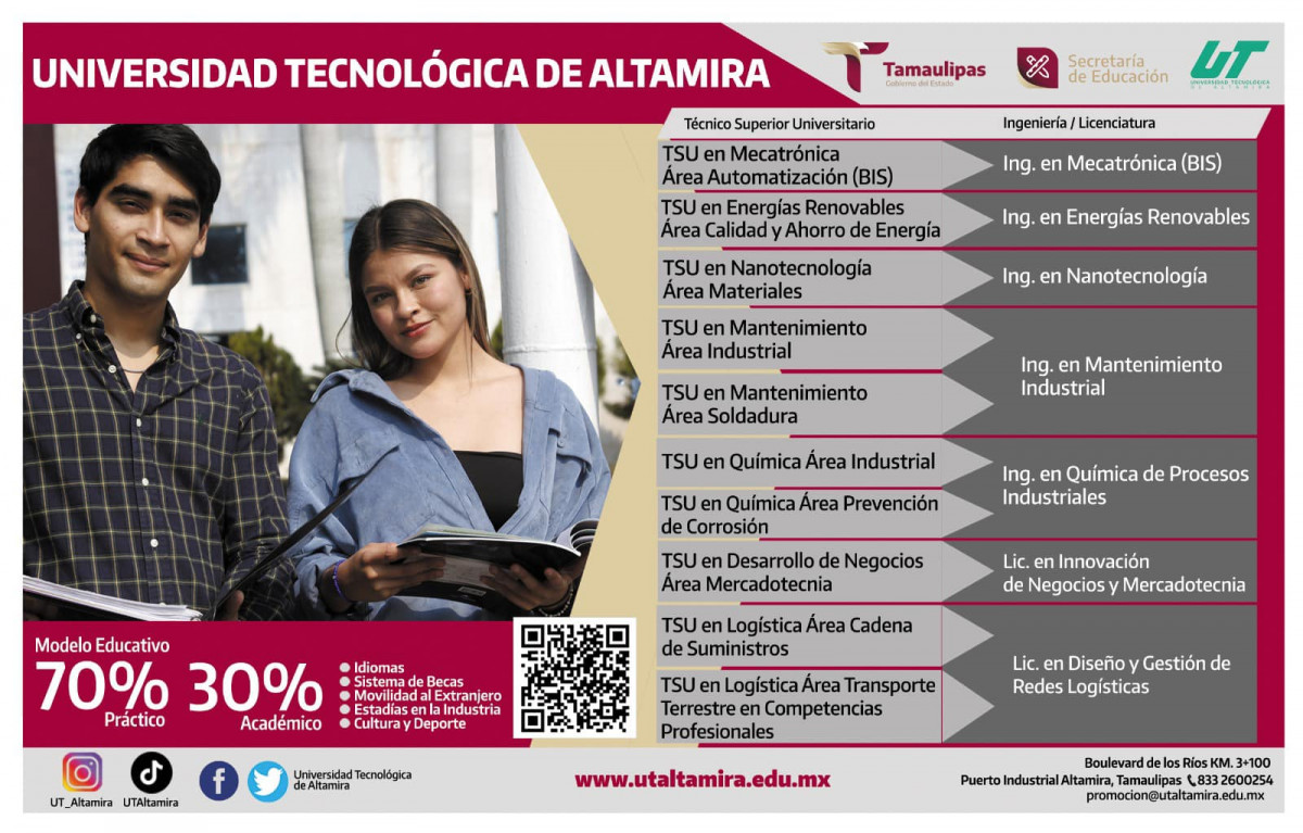 ¡Te esperamos en la Universidad Tecnológica de Altamira! Conoce nuestros programas educativos y tramita tu ficha en línea a partir del 8 de enero de 2024 en: http://sice.rf.gd