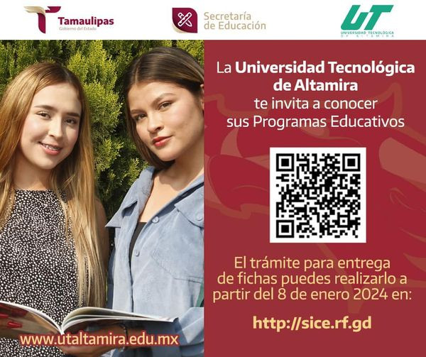 ¡Te esperamos en la Universidad Tecnológica de Altamira! Conoce nuestros programas educativos y tramita tu ficha en línea a partir del 8 de enero de 2024 en: http://sice.rf.gd