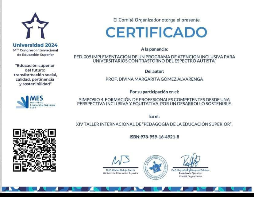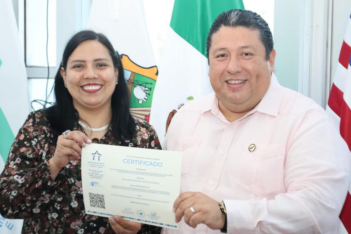 Nuestro rector, el Mtro. Juan Dionisio Cruz Guerrero felicitó a nuestra profesora Divina Margarita Gómez Alvarenga por su participación en el XIV Taller Internacional de “Pedagogía de la Educación Superior” con la ponencia “Implementación de un programa de atención inclusiva para universitarios con trastorno del espectro autista”, del simposio “Formación de profesionales competentes desde una perspectiva inclusiva y equitativa, por un desarrollo sostenible”, organizado por el Ministerio de Educación Superior de Cuba.