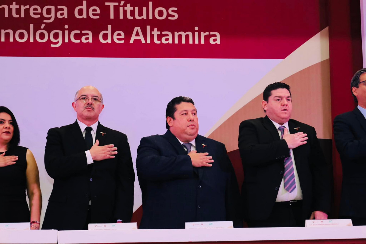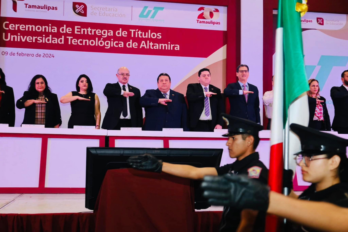 gobernador, Dr. Américo Villarreal Anaya; Dr. Jesús Ricardo Ramos Sánchez, rector de la Universidad Politécnica de Altamira en representación de la Mtra. Lucía Aimé Castillo Pastor, secretaria de Educación de Tamaulipas; Ursula Patricia Salazar Mojica, presidenta de la Junta de Coordinación Política del Congreso de Tamaulipas y del Diputado Federal Erasmo González Robledo.