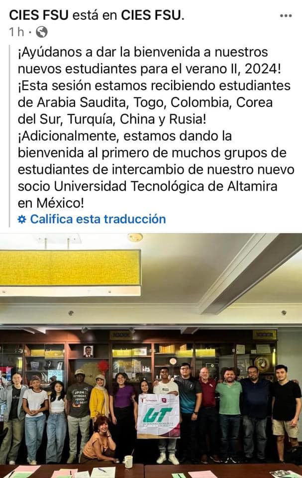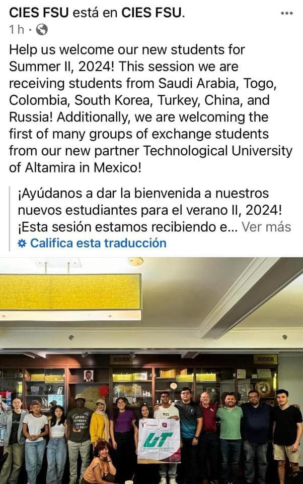 cuatro estudiantes y dos profesores iniciaron una estancia en Tallahassee, Estados Unidos para comenzar respectivamente los programas de formación “Intensive Advance English Course” y “Teaching English as a Foreign Language (TEFL)” en el Center for Intensive English Studies CIES FSU de la Florida State University