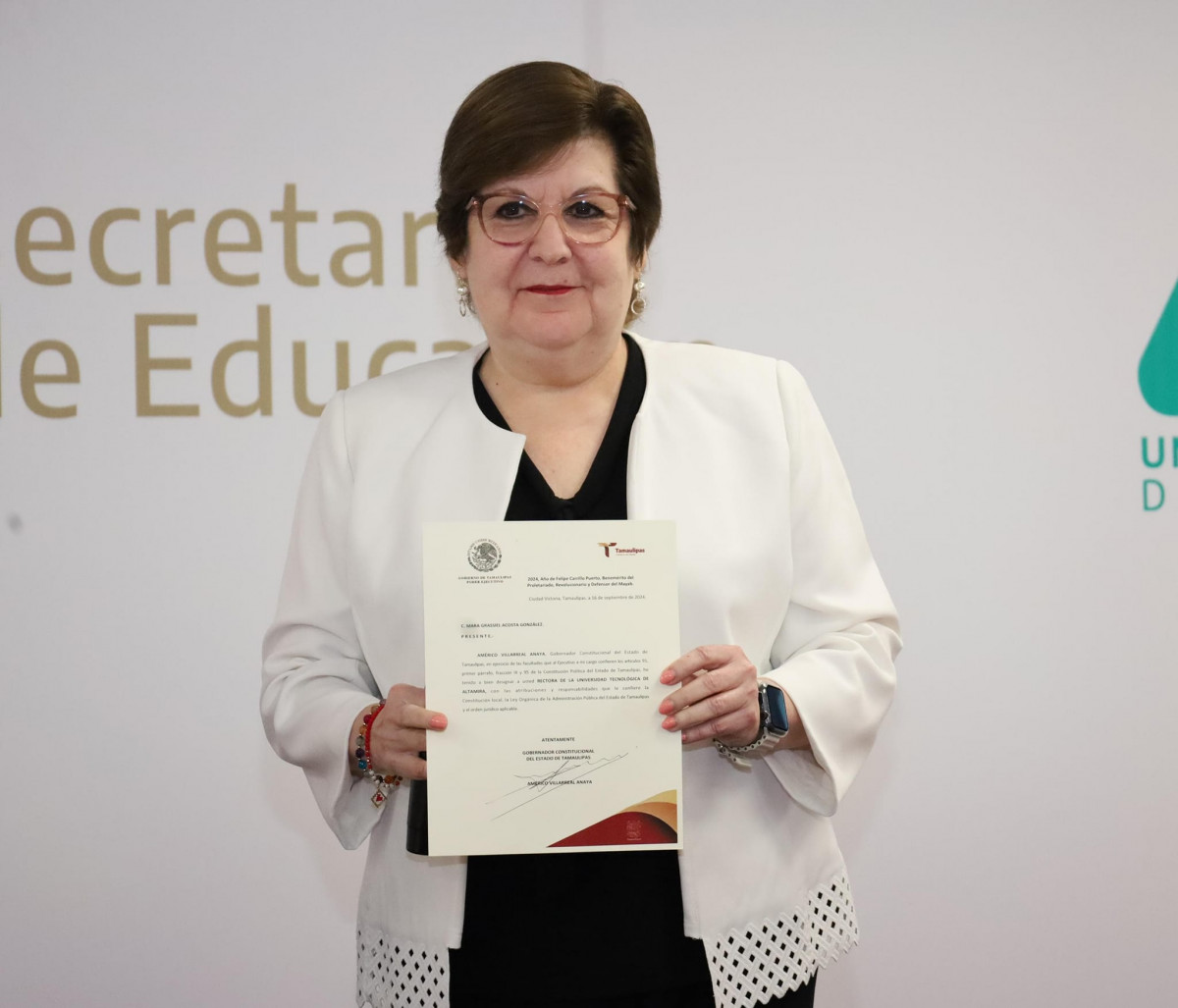El gobernador de Tamaulipas Dr. Américo Villarreal tuvo a bien designar como Rectora de la Universidad Tecnológica de Altamira a la Dra. Mara Grassiel Acosta González, quien a partir hoy 17 de Septiembre de 2024 estará al frente de nuestra querida institución.