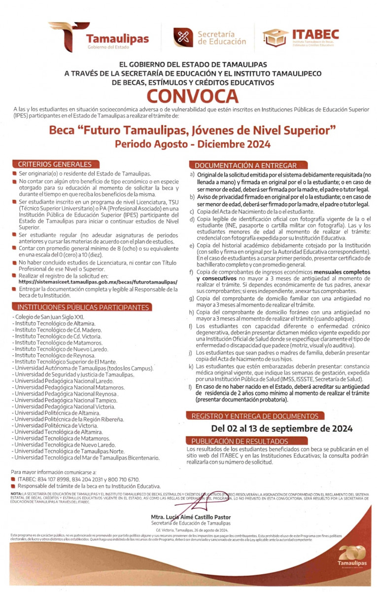 Tramita tu beca «Futuro Tamaulipas, Jóvenes de Nivel Superior», aquí te compartimos la convocatoria del periodo agosto-diciembre 2024, para que realices tu proceso de registro.