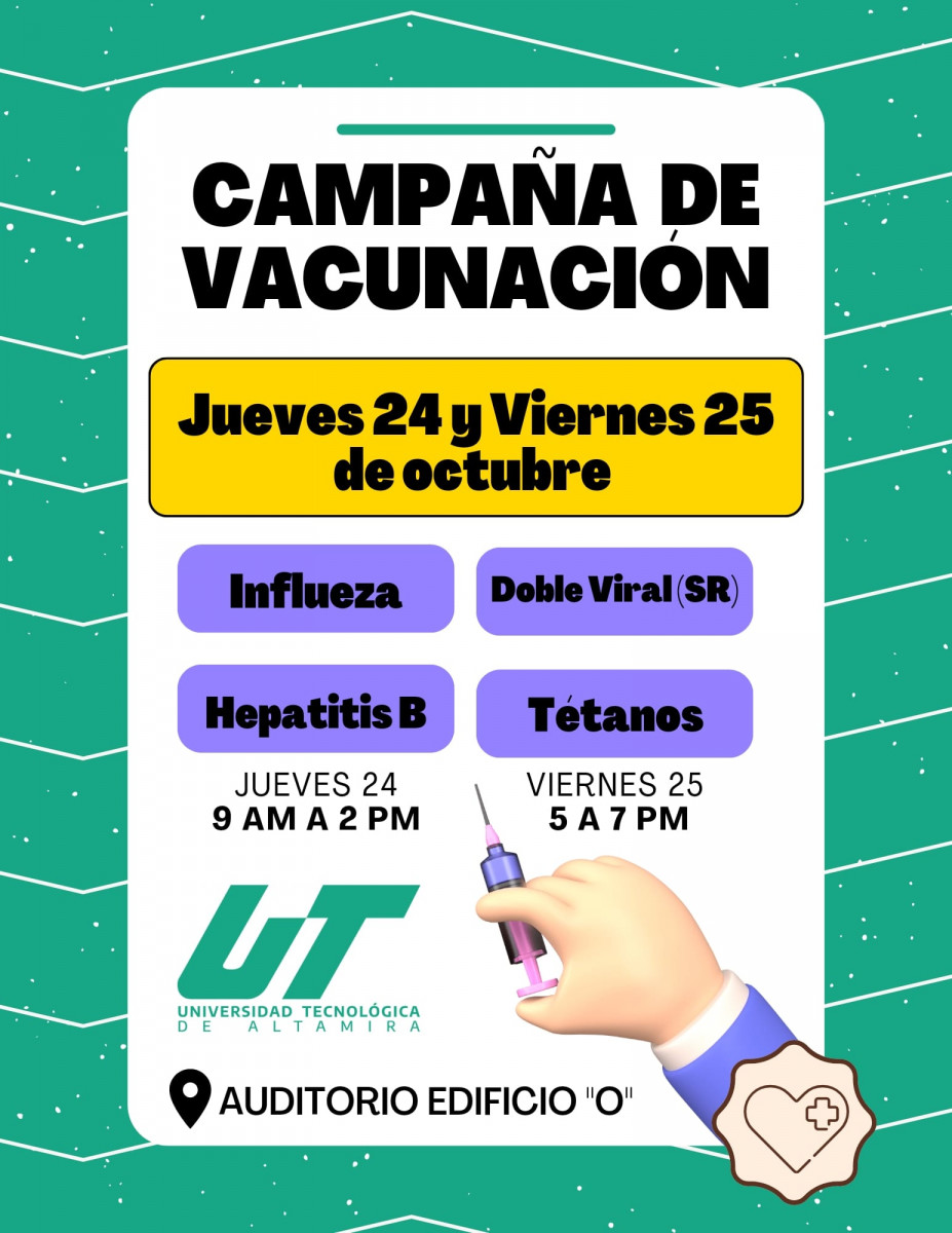 Asiste a la campaña de vacunación que se llevará a cabo los días jueves 24 y viernes 25 de octubre en nuestra universidad por parte de personal de la UMF 10 de Altamira
