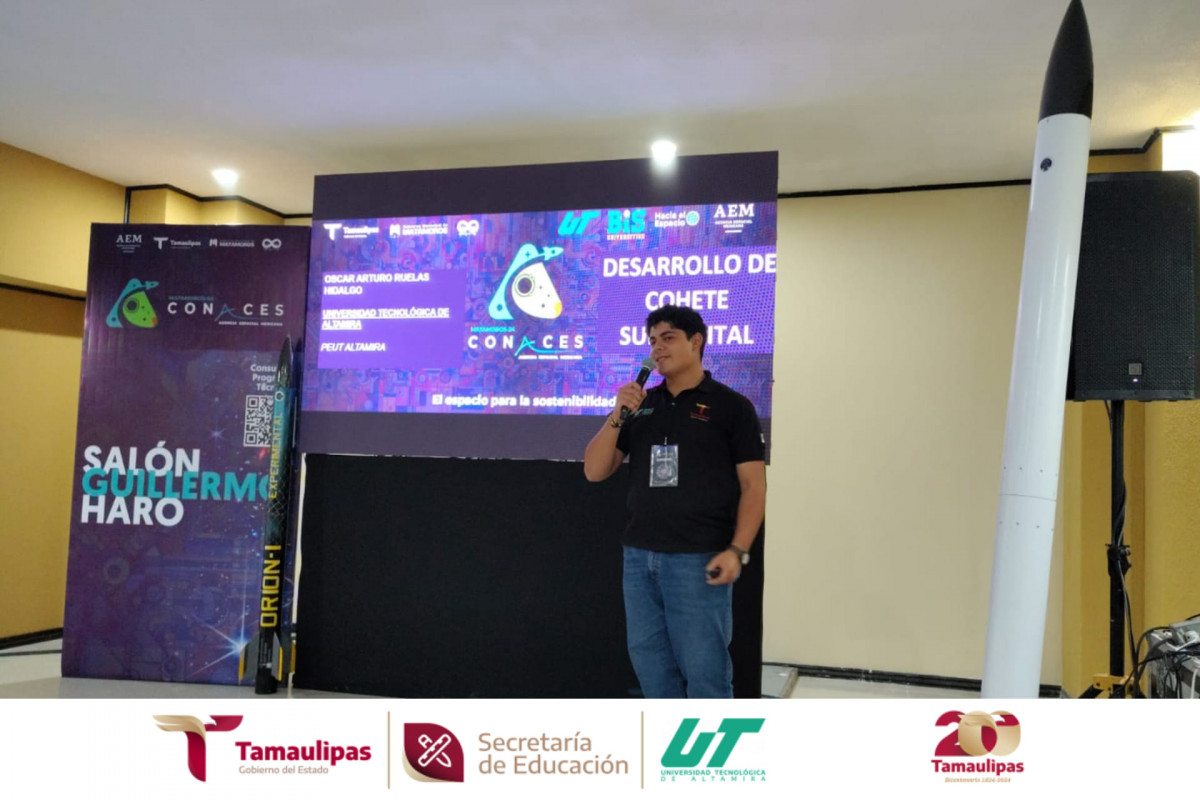 Nuestro alumno Oscar Ruelas de la carrera de Mecatrónica BIS, presentó la conferencia «Desarrollo de un cohete suborbital», dentro de las actividades del quinto Congreso Nacional de Actividades Espaciales CONACES 2024, que se realiza en la ciudad de Matamoros, Tamaulipas.