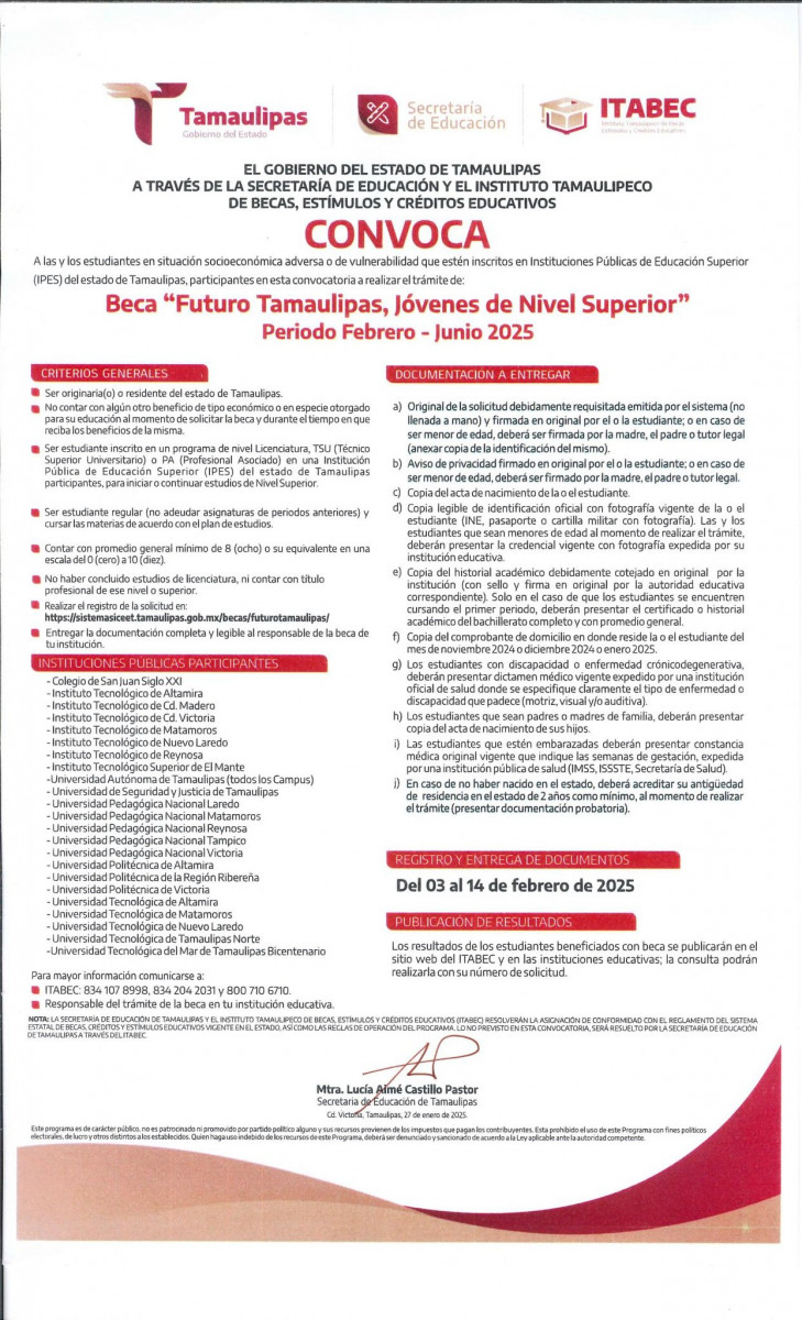 Tramita tu beca «Futuro Tamaulipas, Jóvenes de Nivel Superior», aquí te compartimos la convocatoria del periodo febrero-junio 2025, para que realices tu proceso de registro