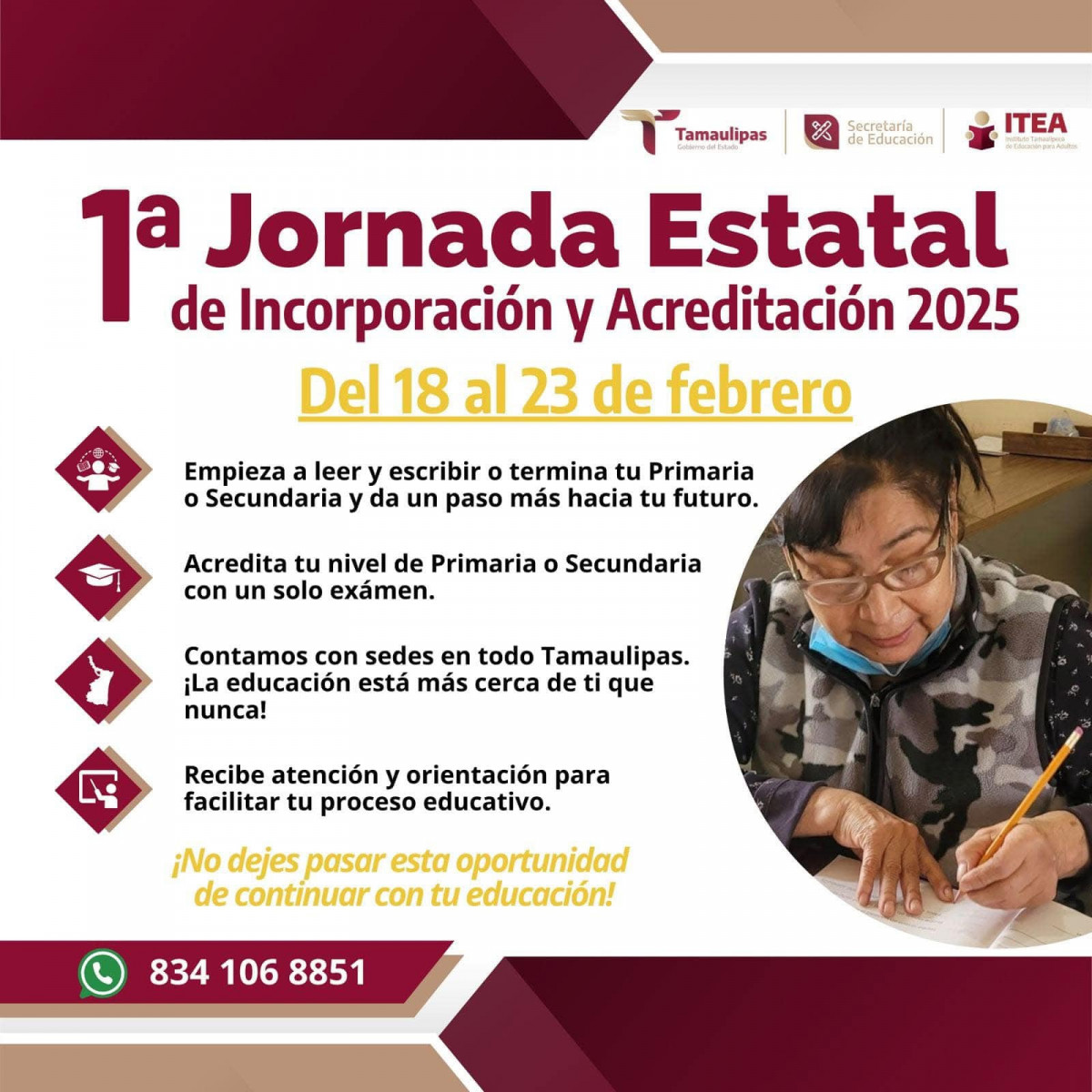 ITEA Tamaulipas invita a personas interesadas de 15 años en adelante, para que aprovechen la oportunidad de iniciar o continuar con sus estudios de educación básica.