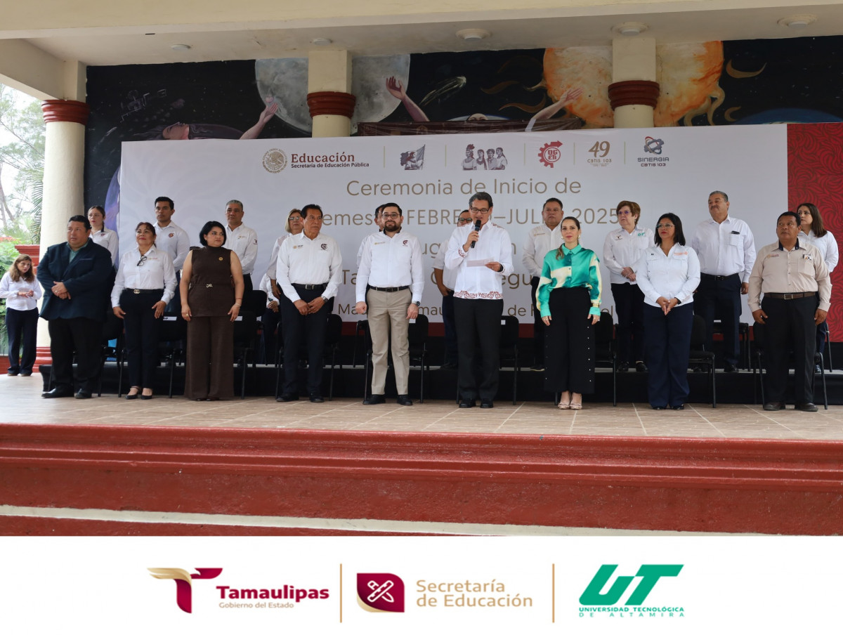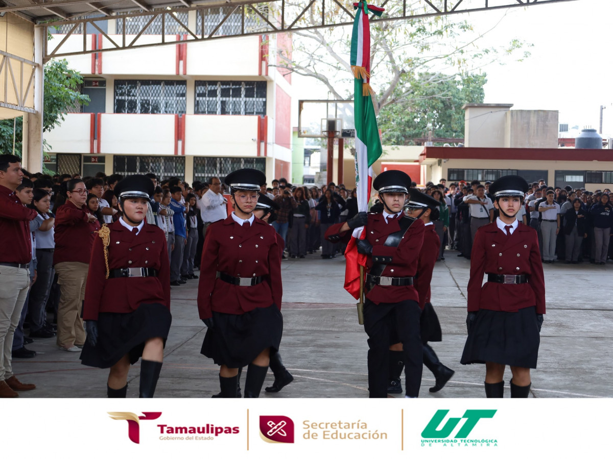 La Rectora de la Universidad Tecnológica de Altamira, el pasado Lunes 10 de febrero de 2025, en punto de las 8:30 a.m., a la Ceremonia Cívica de inicio de semestre febrero-julio 2025 en el Centro de Bachillerato Tecnológico Industrial y de Servicios (CBTIS) No. 103 «Francisco Javier Mina».