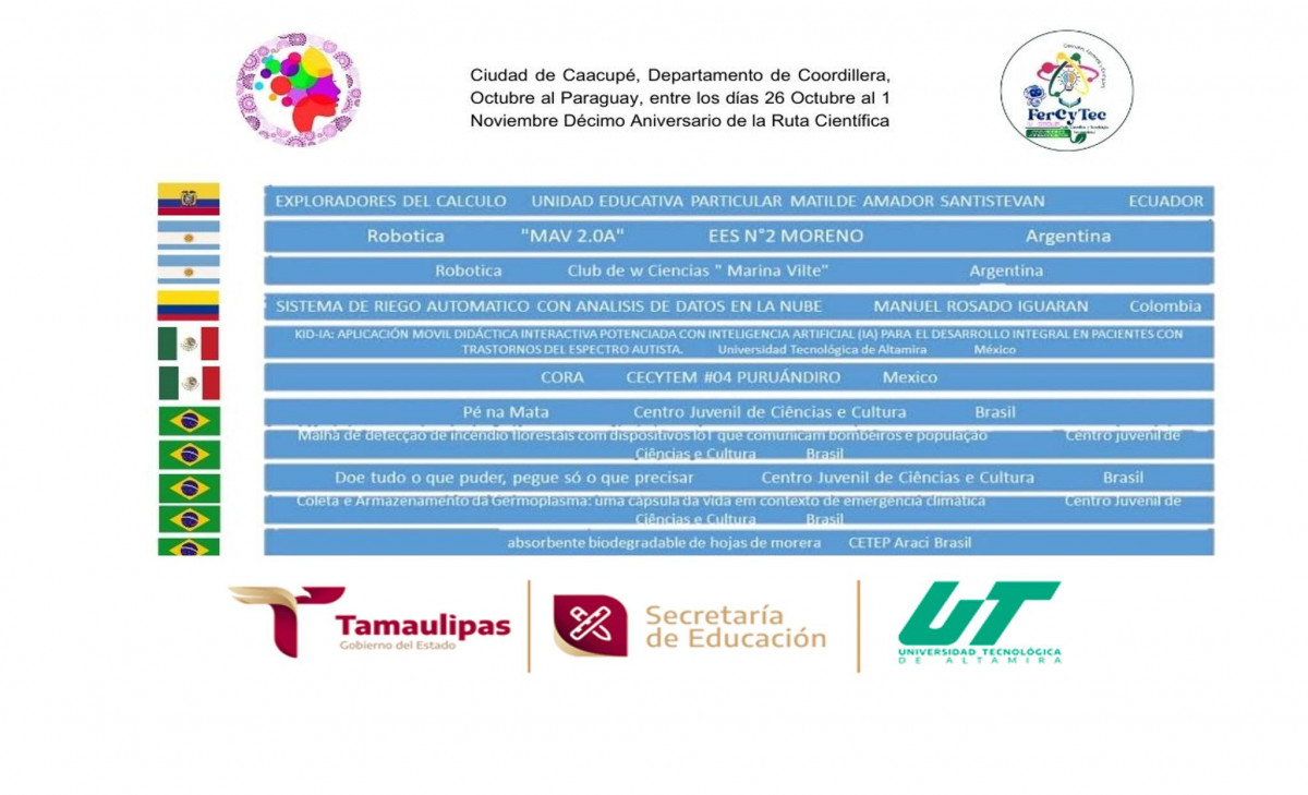 Muchas felicidades a los estudiantes: Víctor Eduardo Acosta Villalón, Luis Jerónimo Loera Moreno, Rubén Alexander Rodríguez Muñoz del programa educativo de Mecatrónica y a sus asesores: Mtro. José Antonio Rodríguez Ahumada y el Dr. Diego Arturo Soto Monterrubio, por su transcendental participación en el proyecto: KID-IA: APLICACIÓN MOVIL DIDÁCTICA INTERACTIVA POTENCIADA CON INTELIGENCIA ARTIFICIAL (IA) PARA EL DESARROLLO INTEGRAL EN PACIENTES CON TRASTORNOS DEL ESPECTRO AUTISTA, al obtener la acreditación internacional para participar en la Feria Científica y Tecnológica Internacional (FerCyTec) 2025, que se llevará a cabo de forma presencial en Caacupé, Paraguay en octubre de 2025.