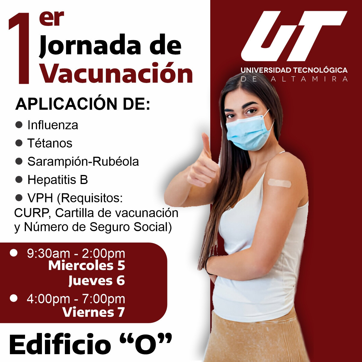 ¡Atención Comunidad Universitaria de la UTALT! Te invitamos a la 1ª Jornada de Vacunación 2025 donde podrás proteger tu salud y la de los demás