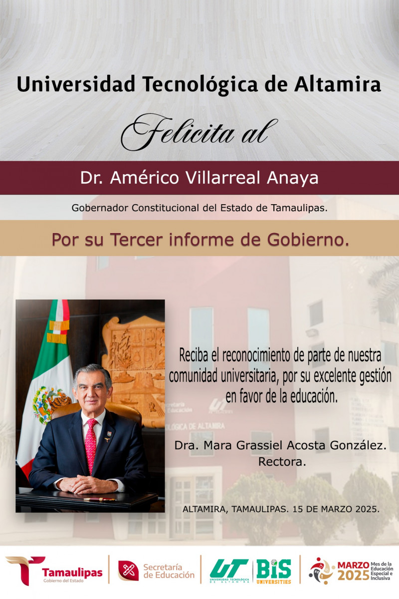 «La Universidad Tecnológica de Altamira felicita a nuestro gobernador, el Dr. Américo Villarreal Anaya, por su Tercer informe.»