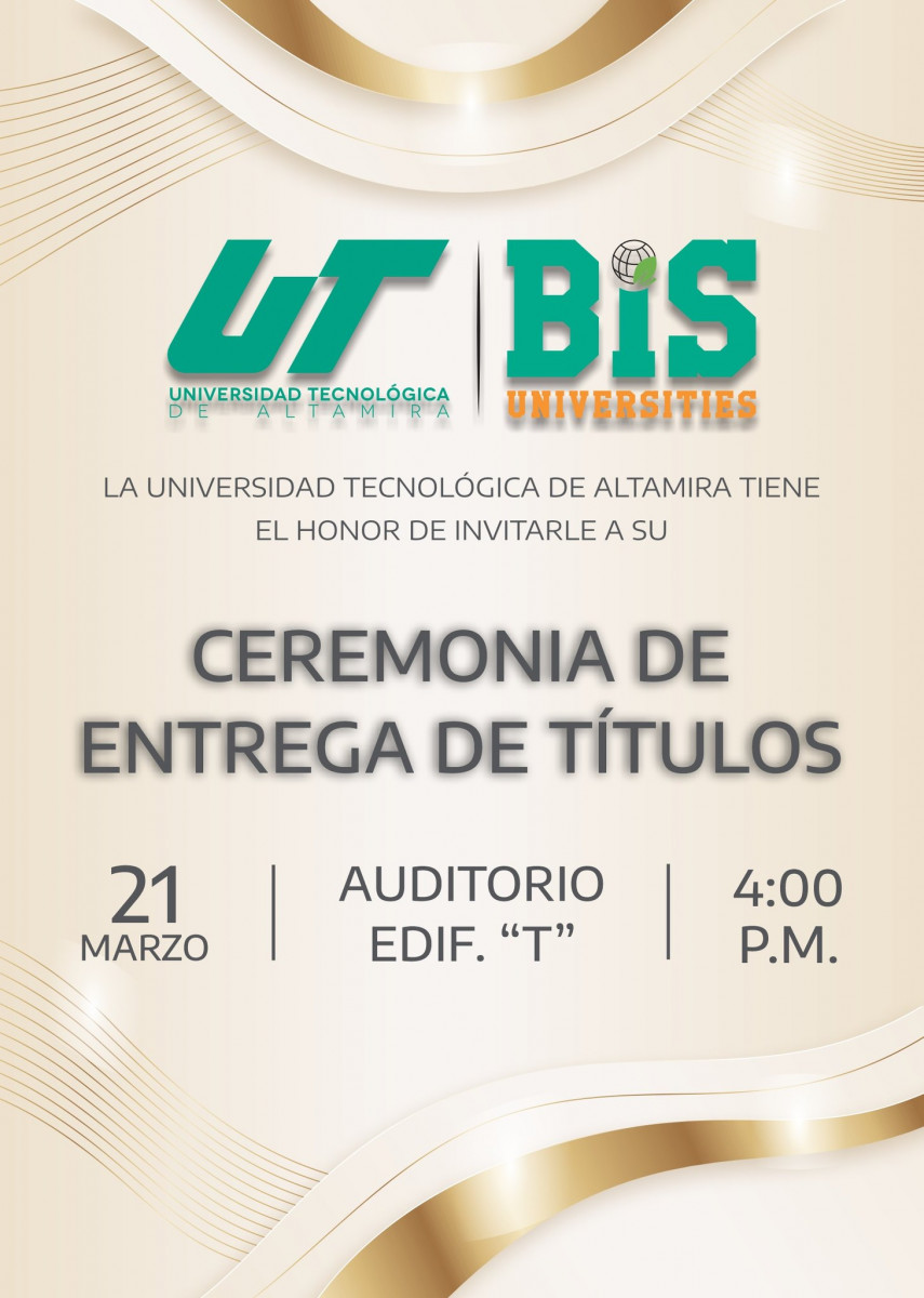 Están cordialmente invitados a la Ceremonia de entrega de Títulos de Técnico Superior Universitario, que se realizará el próximo viernes 21 de marzo de 2025 en el Auditorio T de la Universidad Tecnológica de Altamira, a las 4:00 pm.