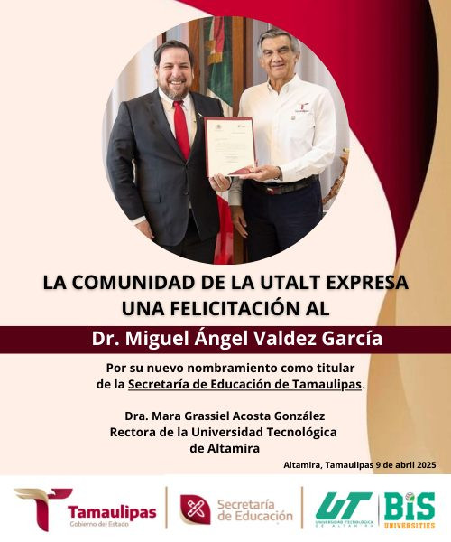 La Universidad Tecnológica de Altamira felicita al Dr. Miguel Ángel Valdez García. Por su nuevo nombramiento como titular de la Secretaria de Educación de Tamaulipas.