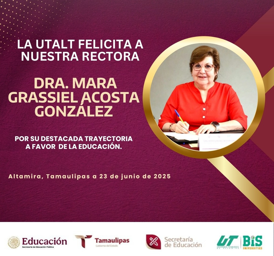 La comunidad de la Universidad Tecnológica de Altamira felicita con orgullo a su Rectora, Dra. Mara Grassiel Acosta González, quien fue reconocida con la Medalla “Mtro. Rafael Ramírez” por 30 años de servicio en los Institutos Tecnológicos del TecNM, la cual fue entregada durante una emotiva ceremonia en el Instituto Tecnológico de Matamoros, en presencia de autoridades educativas y miembros de la comunidad tecnológica.