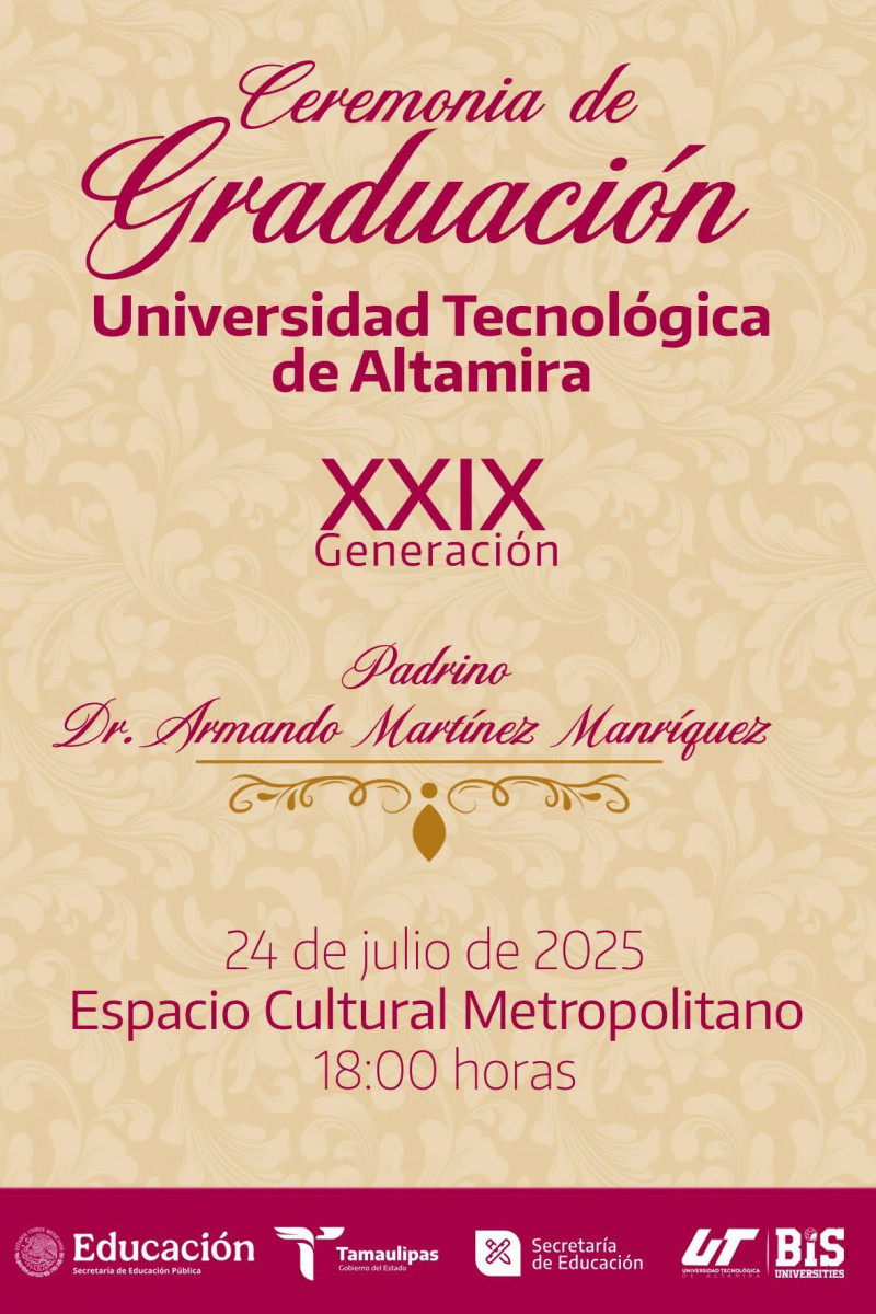 La Universidad Tecnológica de Altamira invita con orgullo a las y los graduados de la XXIX Generación a su evento más significativo del año, que se celebrará el próximo: