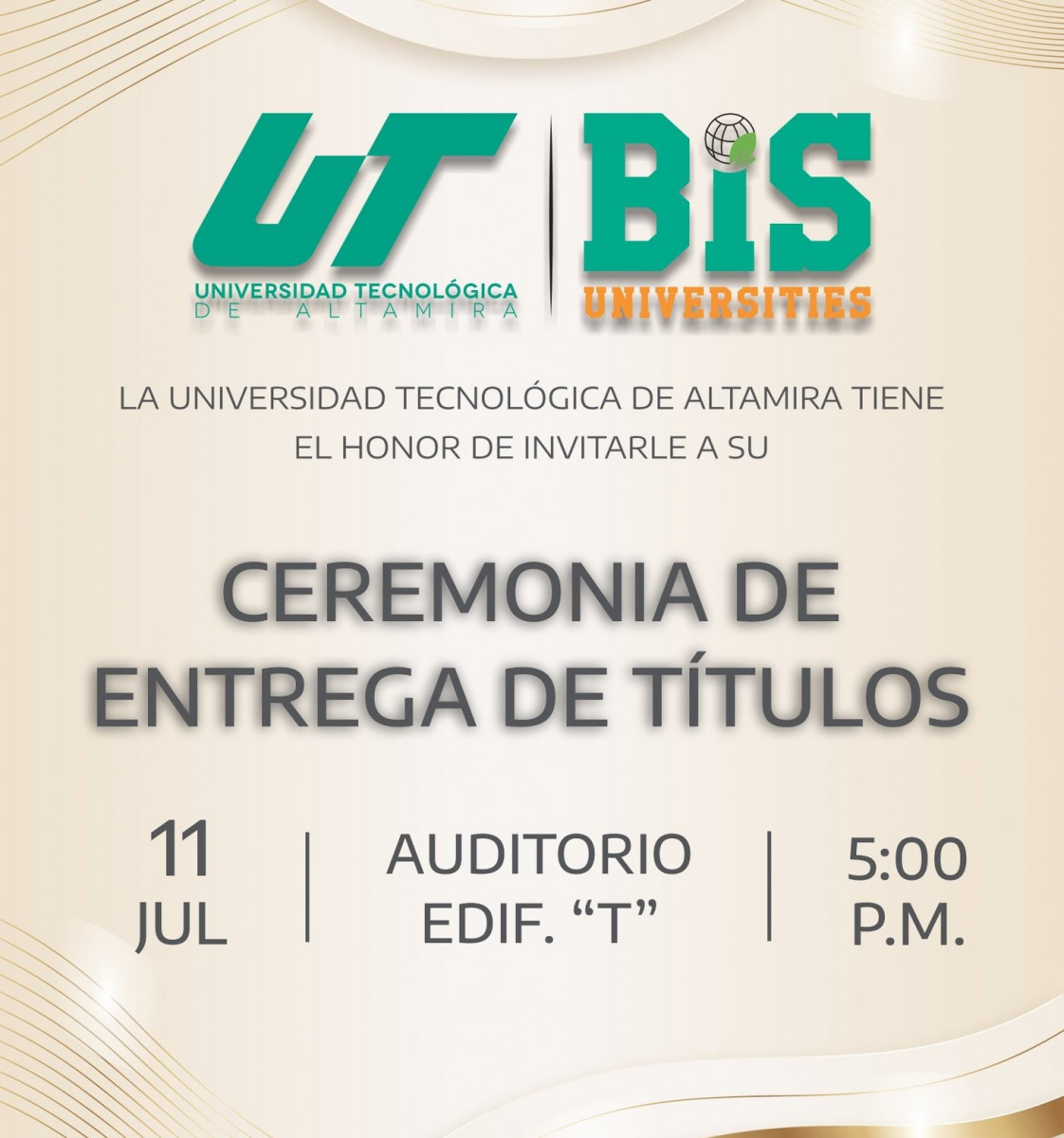 Están cordialmente invitados a la Ceremonia de Entrega de Títulos de Ingeniería, que se llevará a cabo el próximo 11 de julio del presente año a las 05:00 p.m., en el auditorio del edificio «T».