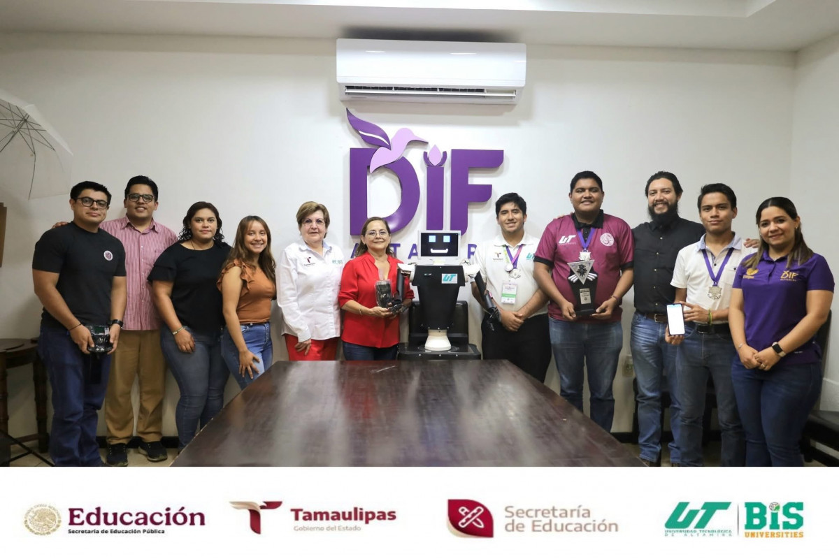 Los equipos KID-IA y BAN-BOT «Dragoncito», integrados por estudiantes de la Universidad Tecnológica de Altamira (UTALT), visitaron las instalaciones del Sistema DIF Altamira, donde presentaron sus proyectos tecnológicos a la C.P. Rosa Irma Luque Pérez, Presidenta del Sistema DIF Altamira, y a la Lic. Dunia Cornejo Belaunzarán, Directora General del organismo.