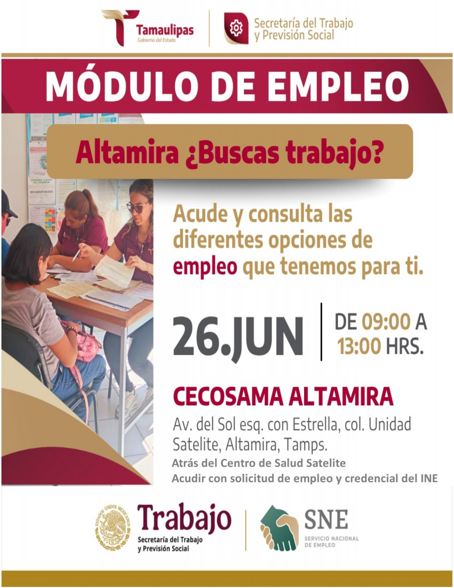 Jornada de empleo en CECOSAMA Altamira, este 26 de junio de 9:00 a 13:00 hrs.