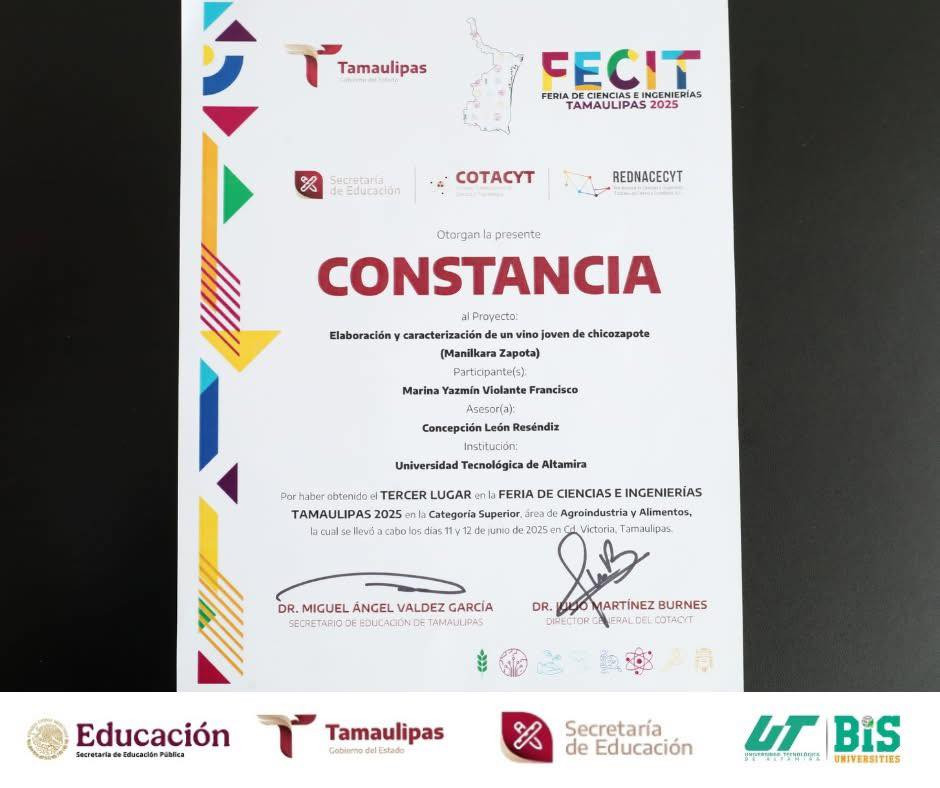 La comunidad de la Universidad Tecnológica de Altamira felicita a Marina Yazmín Violante Francisco, estudiante de TSU en Química Área Industrial (5A), por obtener el 3.er Lugar en la Feria de Ciencias e Ingenierías Tamaulipas 2025, en la categoría Superior – Agroindustria y Alimentos.