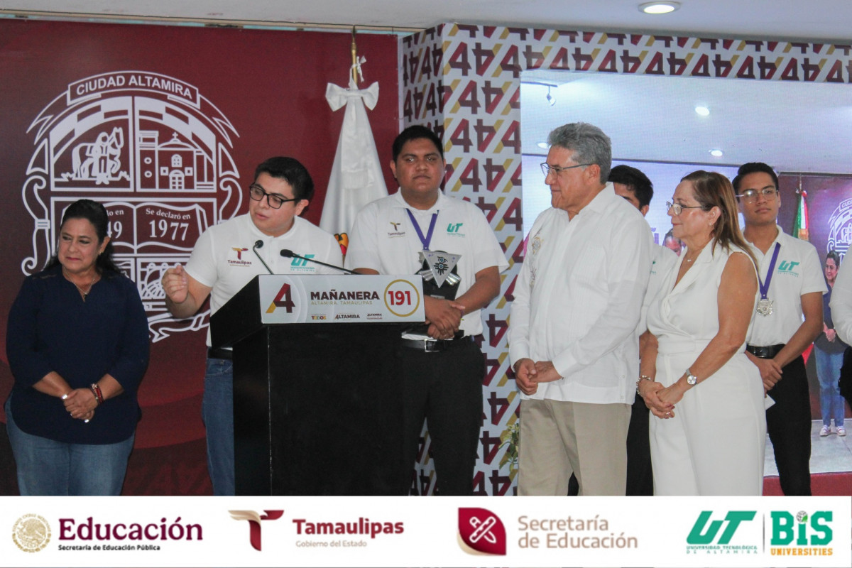 Los equipos KID-IA y BAN-AIDRO, integrados por talentosos estudiantes de nuestra universidad participaron con gran entusiasmo en la Conferencia Mañanera No. 191, encabezada por el Dr. Armando Martínez Manríquez, Presidente Municipal de la Ciudad y Puerto de Altamira.