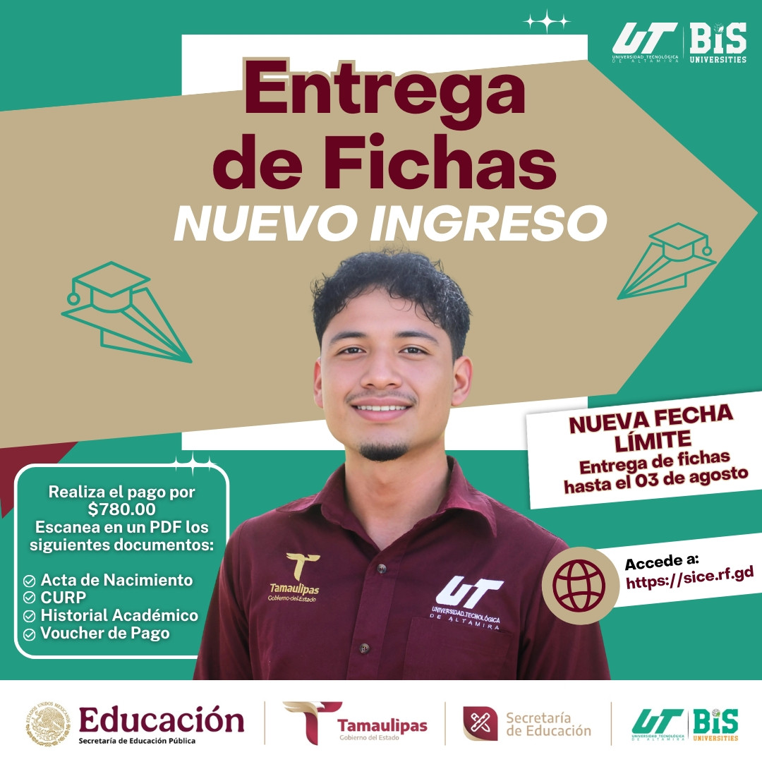La Universidad Tecnológica de Altamira extiende la fecha límite para entrega de fichas de nuevo ingreso hasta el 03 de agosto.