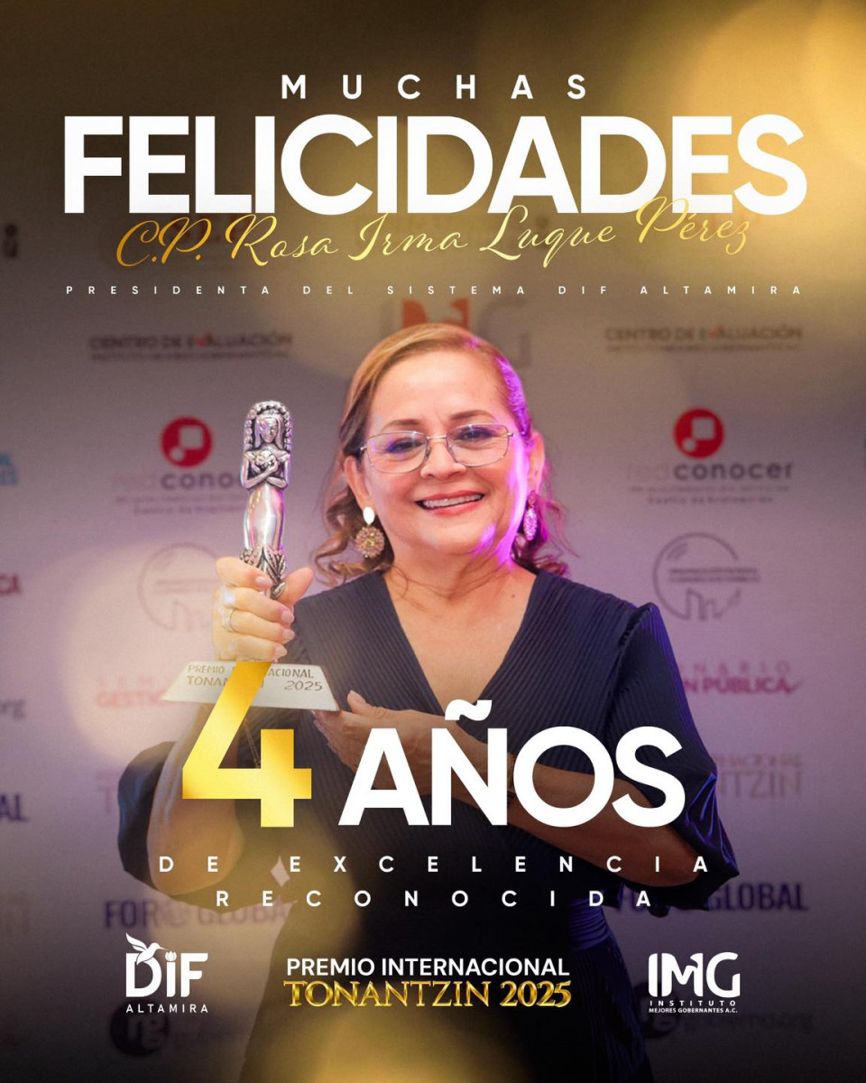 DIF Altamira, estamos llenos de orgullo por nuestra presidenta Rossy Luque De Martínez, quien por 4 años seguidos ha sido reconocida con el Premio Internacional Tonantzin 2025