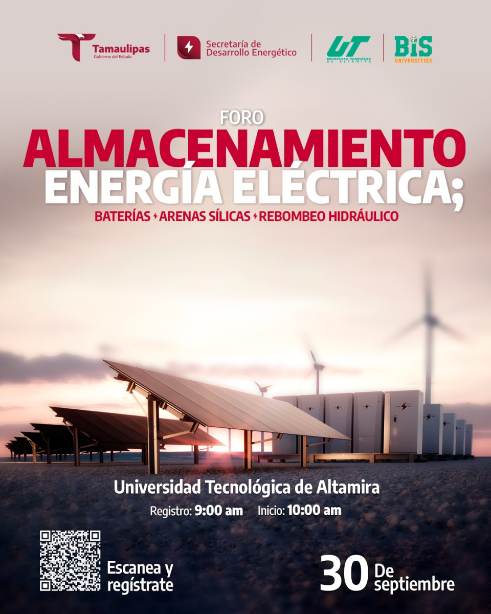 La Secretaría de Desarrollo Energético de Tamaulipas y la Universidad Tecnológica de Altamira invitan a la comunidad académica, empresarial y público en general a participar en el Foro “Almacenamiento de Energía Eléctrica”, un espacio para el intercambio de ideas, innovación y desarrollo de soluciones sostenibles para el futuro energético.