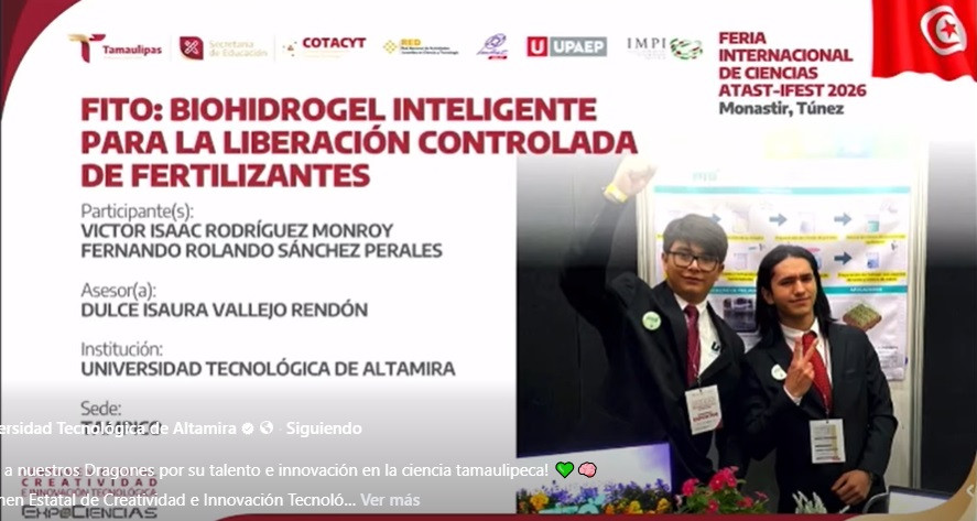 En el Certamen Estatal de Creatividad e Innovación Tecnológica “EXPOCIENCIAS TAMAULIPAS”, los estudiantes Víctor Isaac Rodríguez Monrroy y Fernando Rolando Sánchez Perales, de la Ingeniería en Nanotecnología, presentaron el innovador proyecto “Fito: Biohidrogel inteligente para la liberación controlada de fertilizantes”, bajo la asesoría de la Dra. Dulce Isaura Vallejo Rendón.