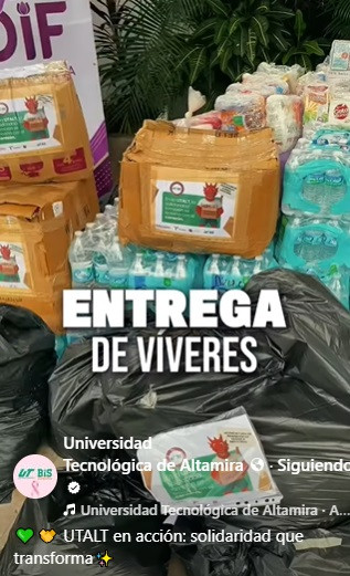 La UTALT entregó ropa, víveres y artículos de limpieza e higiene al Sistema DIF Altamira, como apoyo a las familias afectadas por las recientes inundaciones.