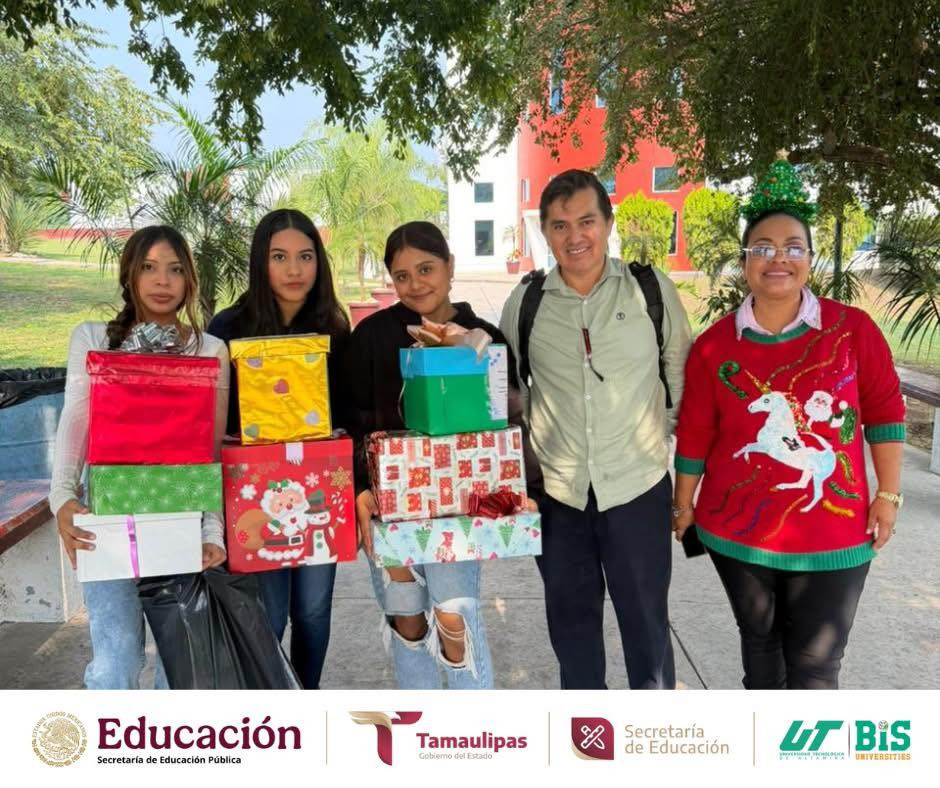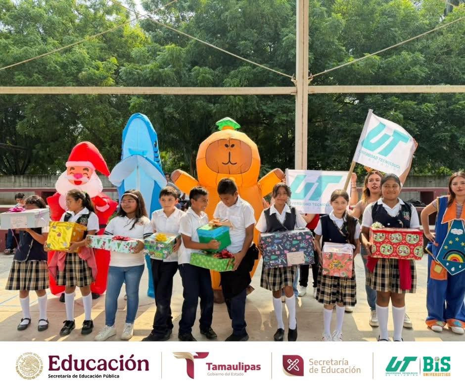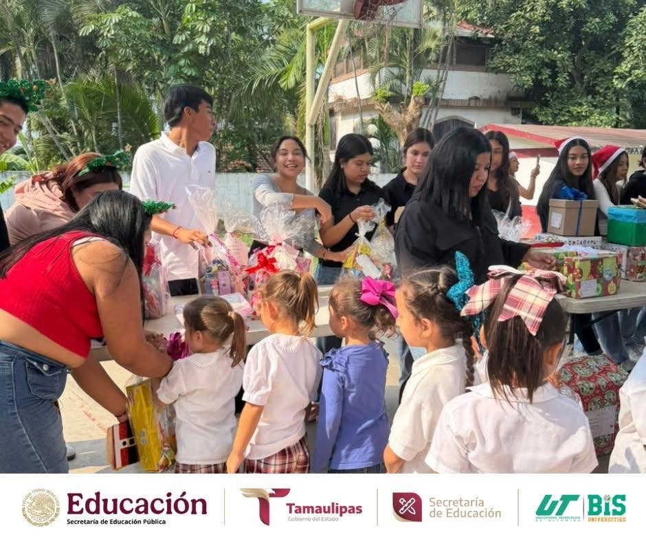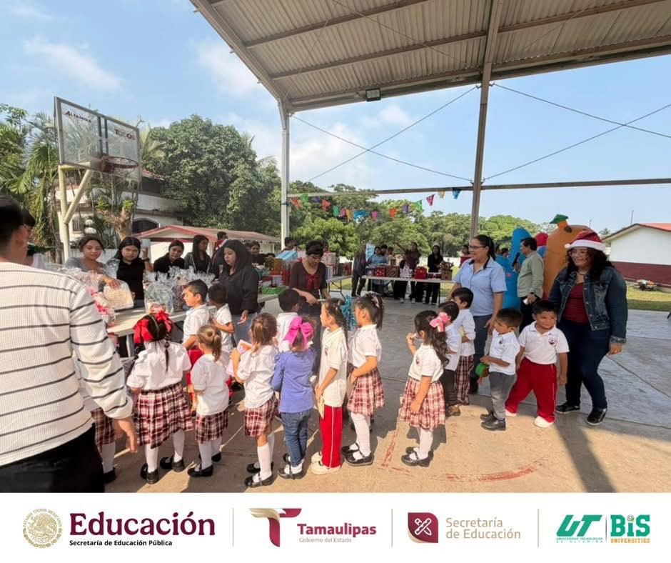Estudiantes de Logística y Negocios de la UTALT llevaron espíritu navideño al Ejido Medrano, en Altamira, con la entrega de cajas sorpresa llenas de regalos para niñas y niños del Jardín de Niños y la Primaria Patrocinio Huerta.