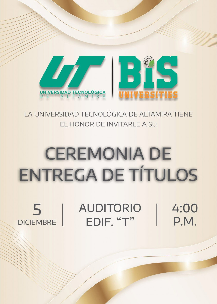La Universidad Tecnológica de Altamira invita a sus egresadas y egresados a la 9na. Ceremonia de Entrega de Títulos, que se realizará el viernes 5 de diciembre de 2025, a las 4:00 p.m., en el Auditorio del Edificio “T”.