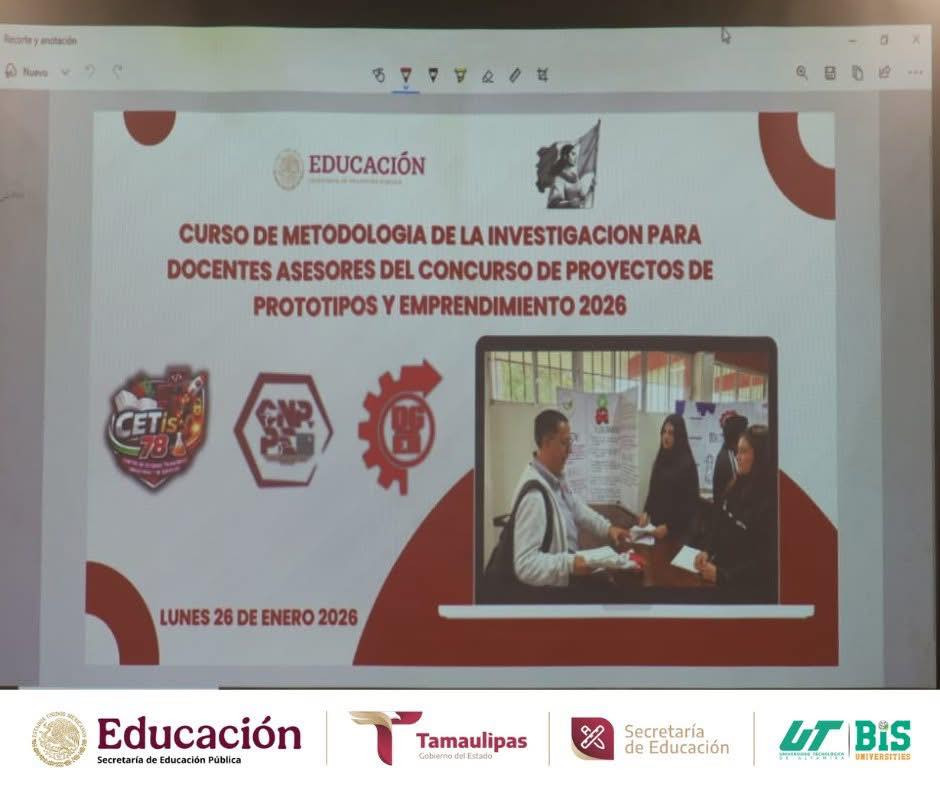 La Universidad Tecnológica de Altamira (UTALT) formó parte del acto de inicio del curso de Metodología de la Investigación para Asesores Docentes de Proyectos de Prototipos y Emprendimiento de la DGETI Zona Sur, desarrollado en la Sala de Lectura del CETis No. 78, en Altamira, Tamaulipas, el cual se llevará a cabo durante toda la semana, reafirmando el compromiso institucional con el fortalecimiento de la coordinación académica, la actualización docente y el impulso a la investigación.