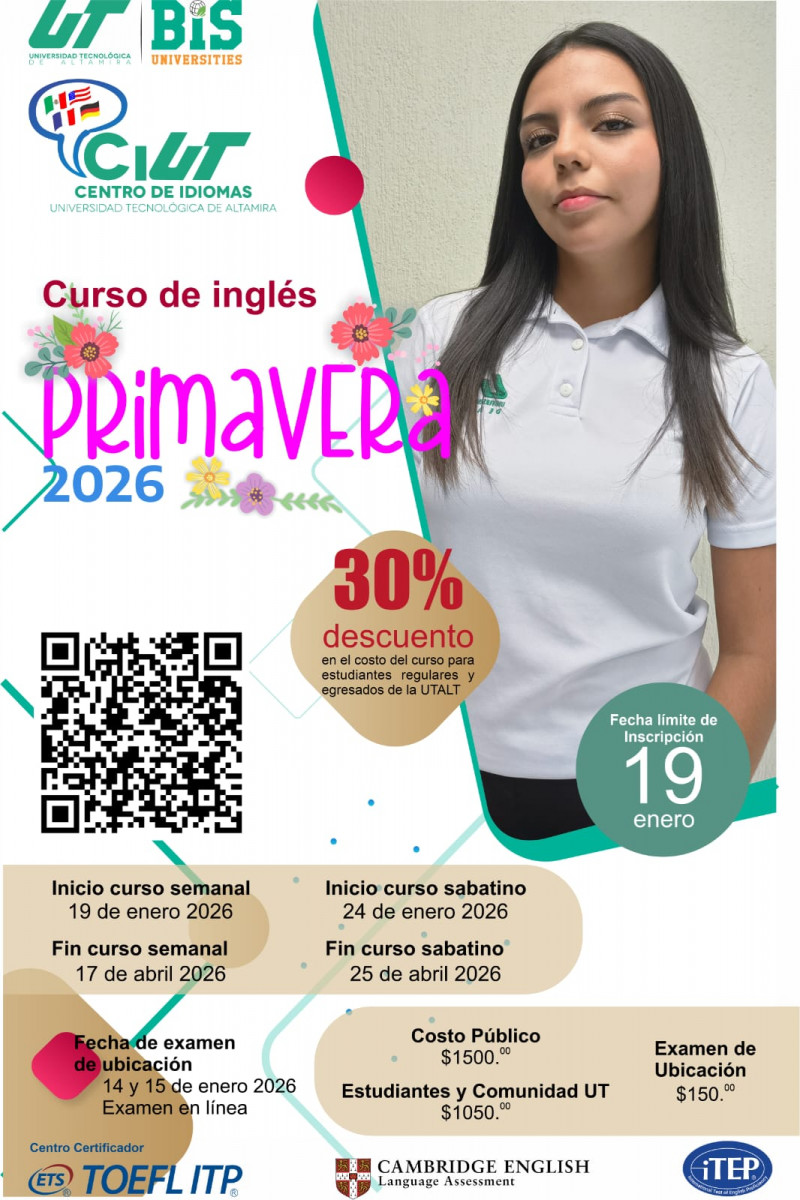 El Centro de Idiomas de la Universidad Tecnológica de Altamira (CIUT) te invita a inscribirte al Curso de Inglés Primavera 2026, una excelente oportunidad para fortalecer tus competencias en el idioma y avanzar hacia certificaciones internacionales.