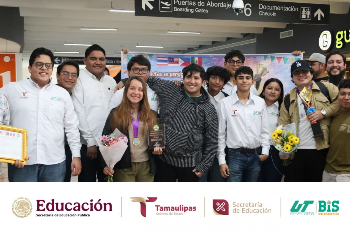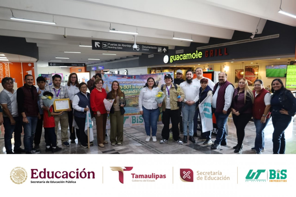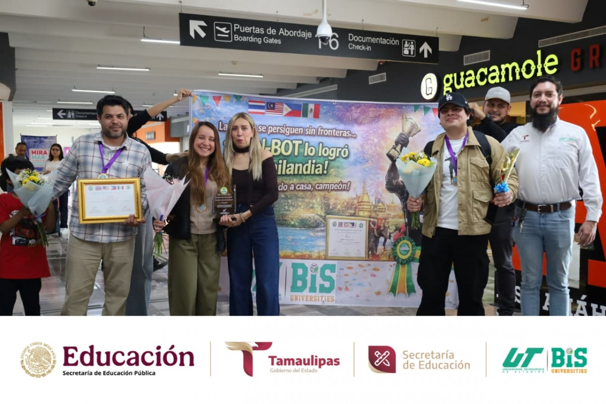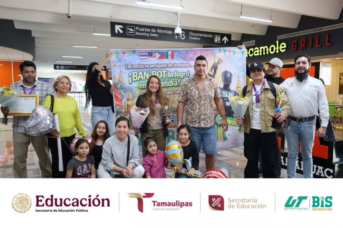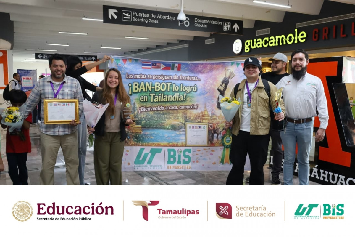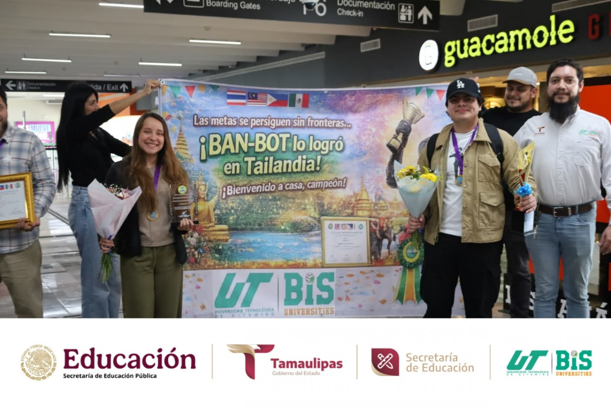 La Universidad Tecnológica de Altamira dio una calurosa bienvenida en el aeropuerto a Fernando Banda Rodríguez y Sofía Ximena Vargas Torres, estudiantes del Programa Educativo de Mecatrónica BIS y creadores del proyecto BanBot, desarrollado bajo la asesoría del Dr. Diego Arturo Soto Monterrubio y el Mtro. José Antonio Rodríguez Ahumada, quienes regresaron a México tras obtener el Primer Lugar General y el Premio de Excelencia en el 5th Phatthalung International Science Fair (PISF) 2026, realizado en Tailandia.