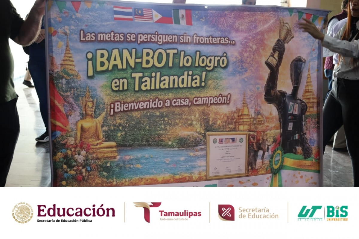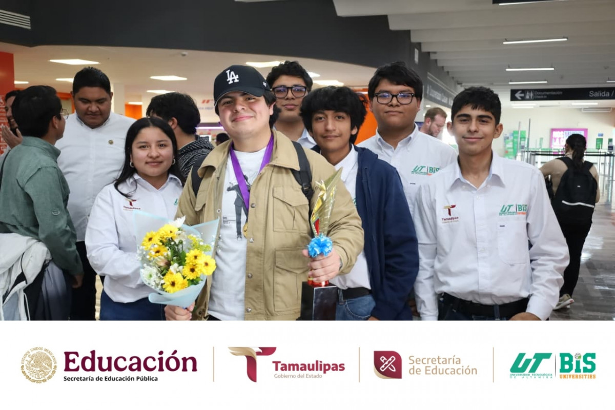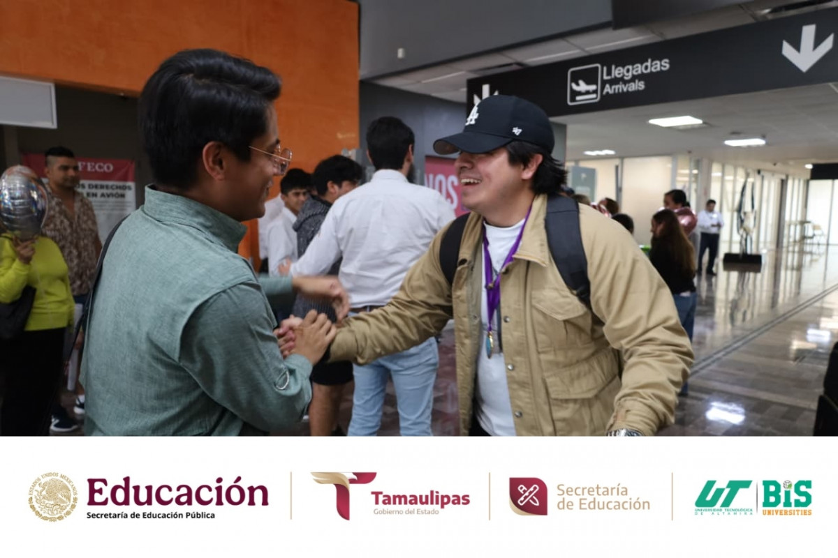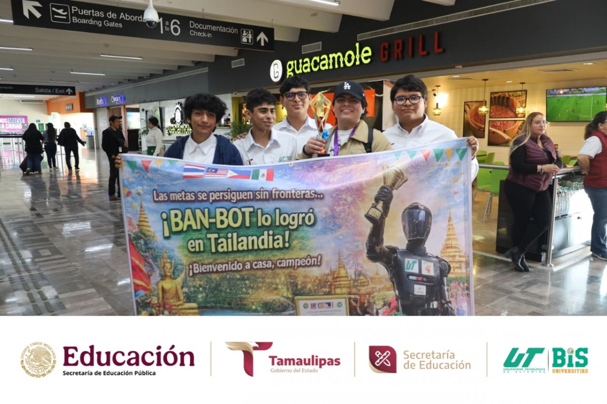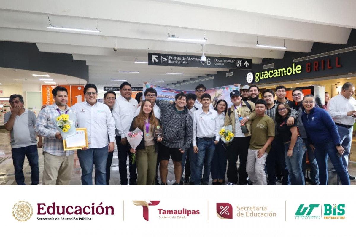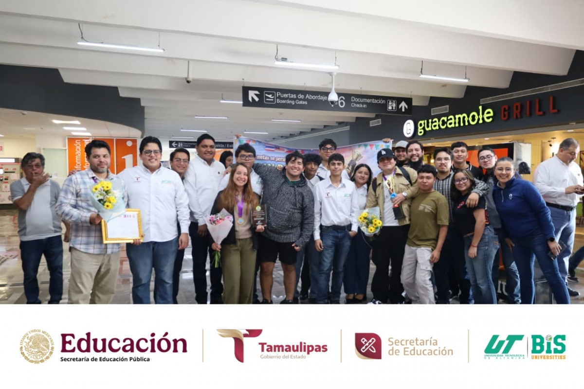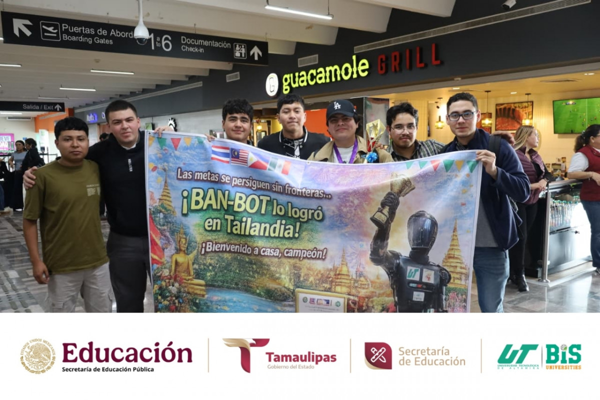 La Universidad Tecnológica de Altamira dio una calurosa bienvenida en el aeropuerto a Fernando Banda Rodríguez y Sofía Ximena Vargas Torres, estudiantes del Programa Educativo de Mecatrónica BIS y creadores del proyecto BanBot, desarrollado bajo la asesoría del Dr. Diego Arturo Soto Monterrubio y el Mtro. José Antonio Rodríguez Ahumada, quienes regresaron a México tras obtener el Primer Lugar General y el Premio de Excelencia en el 5th Phatthalung International Science Fair (PISF) 2026, realizado en Tailandia.