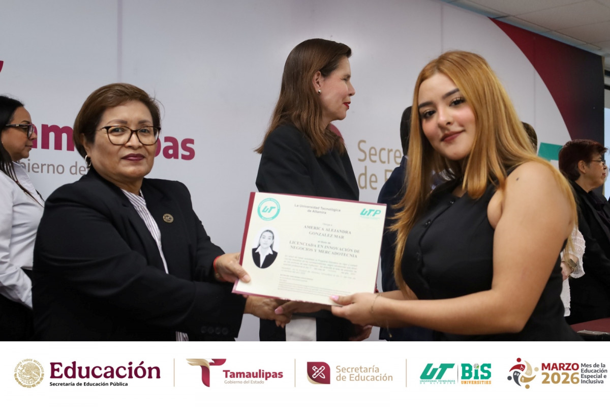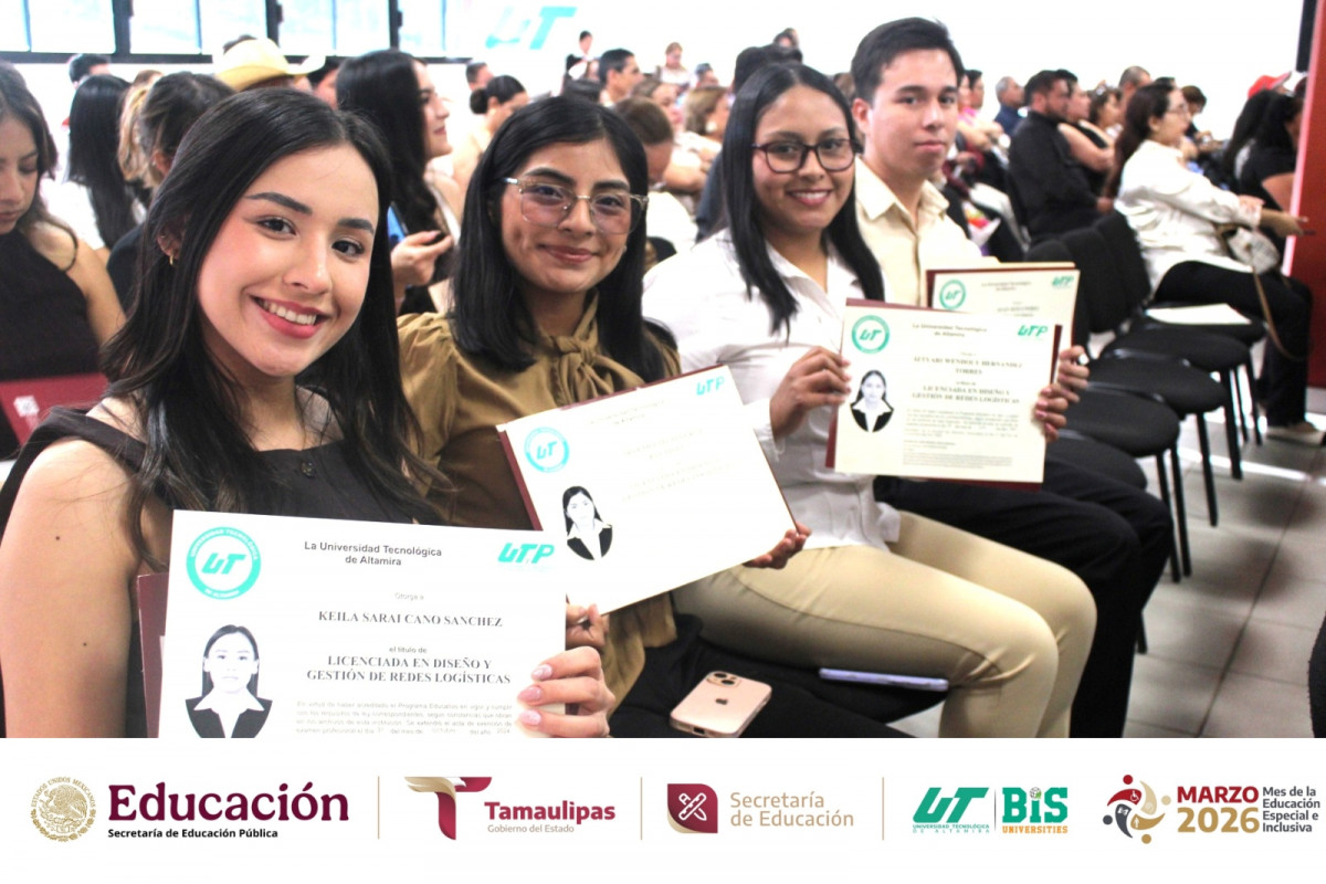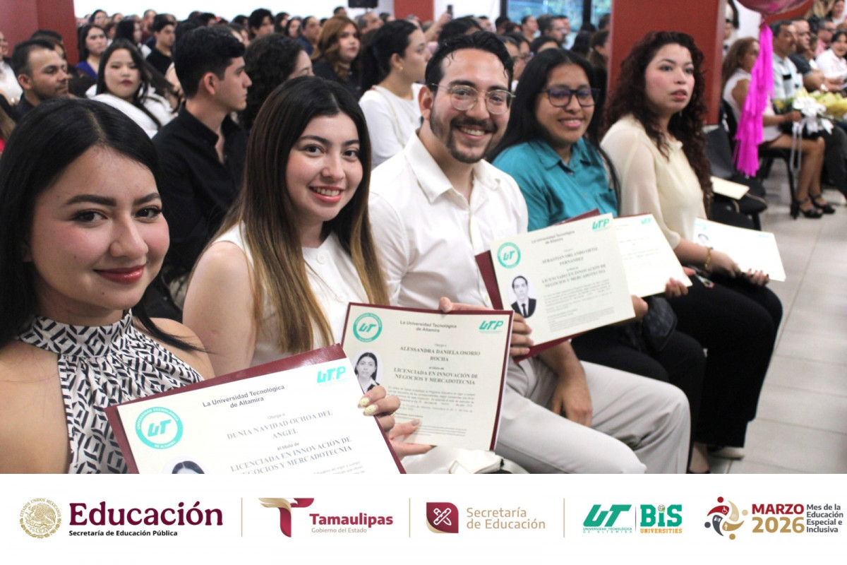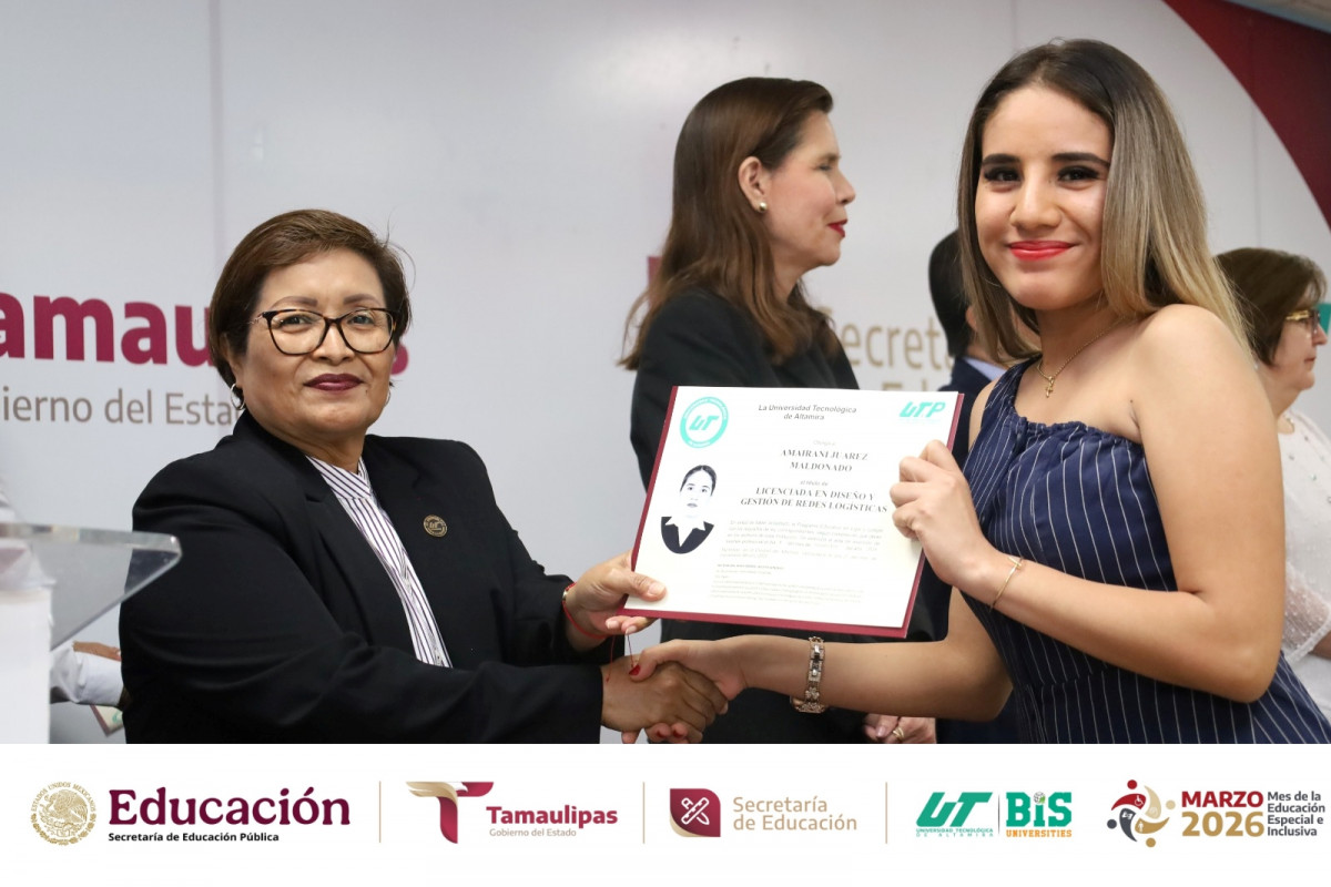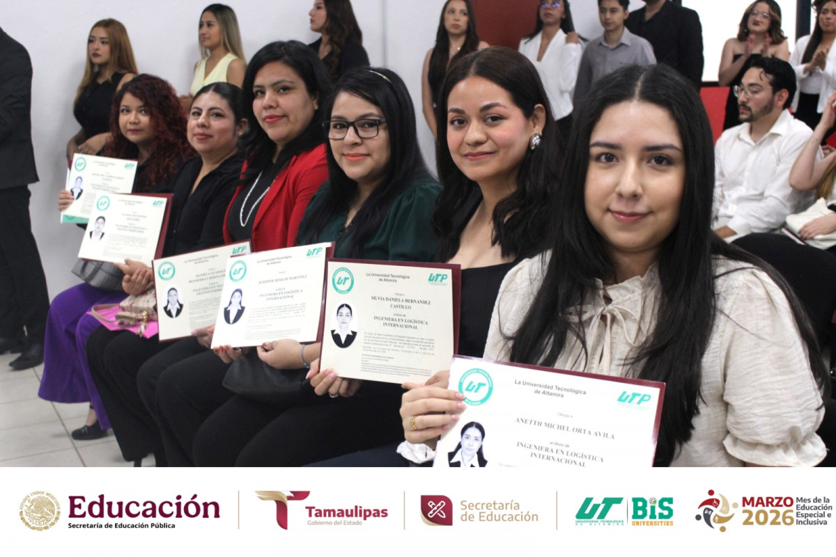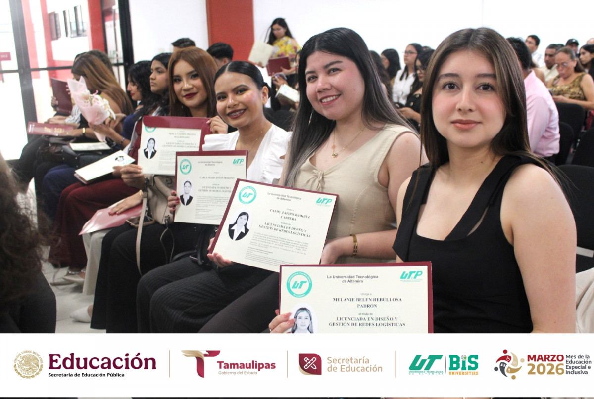 La Universidad Tecnológica de Altamira (UTALT) llevó a cabo la segunda entrega de títulos profesionales 2026 de nivel Ingeniería y Licenciatura en el Auditorio del Edificio T, en una ceremonia encabezada por la Dra. Mara Grassiel Acosta González, rectora de la universidad, acompañada por su cuerpo directivo académico y administrativo.