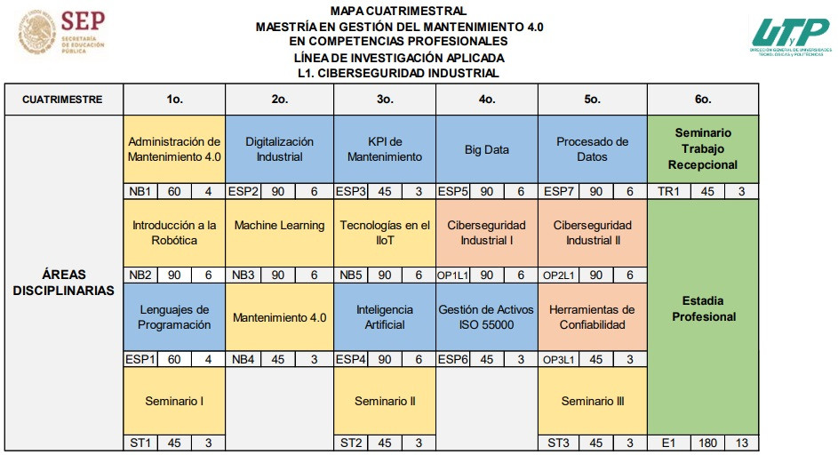 El plan de estudios de la Maestría en Gestión del Mantenimiento 4.0, complementa los conocimientos teóricos con la aplicación práctica de las herramientas administrativas, de programación y ciencia de datos, desarrollando en el participante su capacidad de innovación y liderazgo para el ejercicio profesional. El programa consta de 19 asignaturas y una estadía, distribuidas en 6 cuatrimestres, e incluye la elaboración de tesis con orientación a la línea de investigación aplicada del programa, con réplica en examen oral para la obtención del título correspondiente. La maestría aborda una línea de investigación aplicada: Ciberseguridad Industrial.